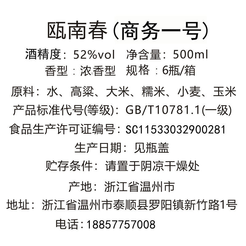Ounan Spring Guanshan Liquor Taishun Specialty Luzhou-flavored Business No. 1 52 degrees FCL bottled 500ml height