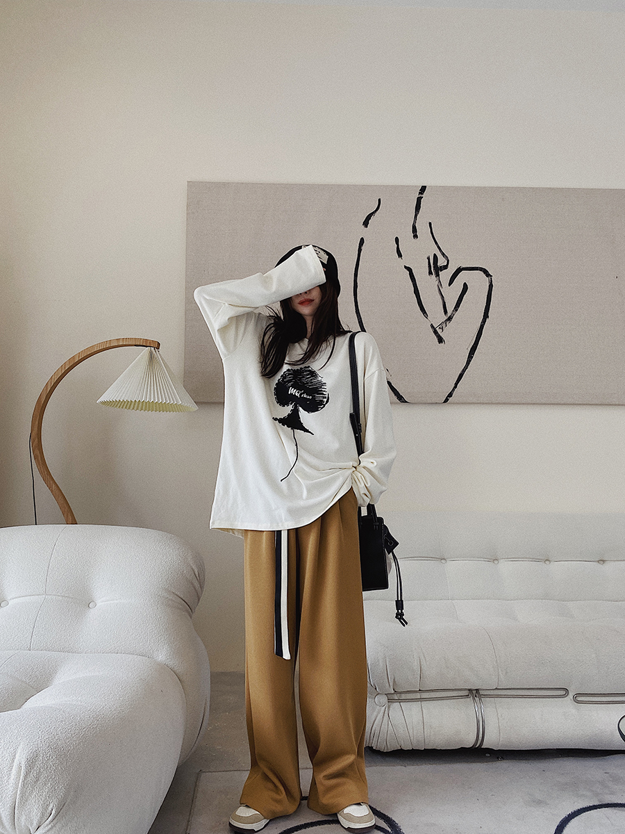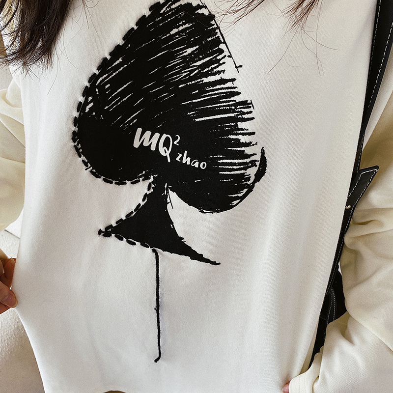 Xiao Nian Custom White Long Sleeve T-Shirt Women's 2021 Fall/Winter New Loose Sanding Printed Interior Backing Shirt Top