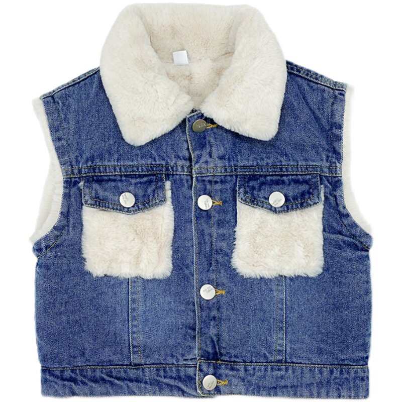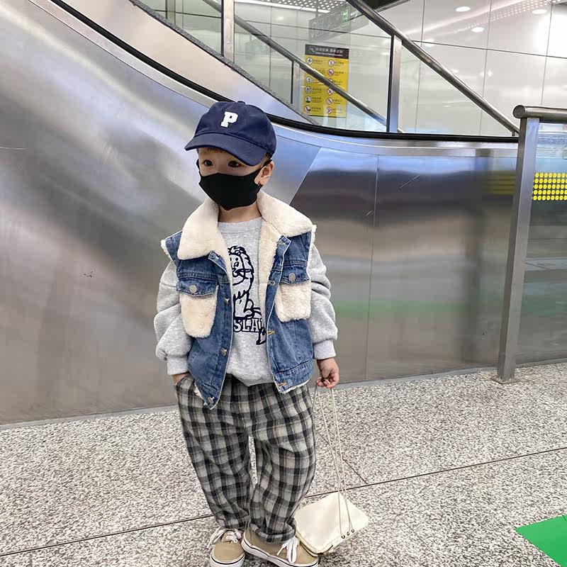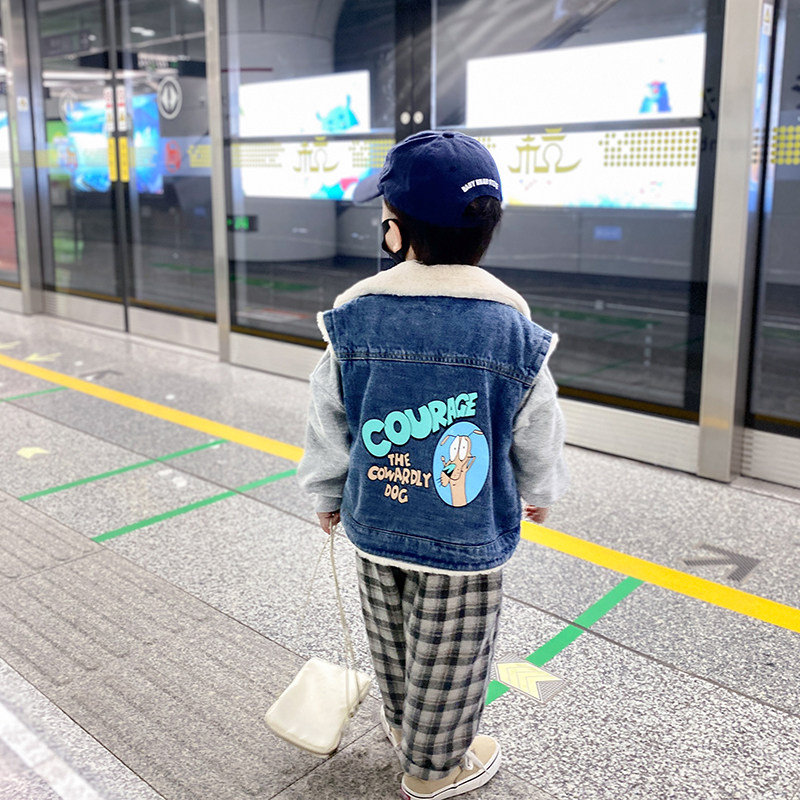 Boy Autumn Winter Dress Denim Machia Child Plus Suede Thickened Foreign Pie Cartoon Print Outside Wearing Male Baby Fall Jacket