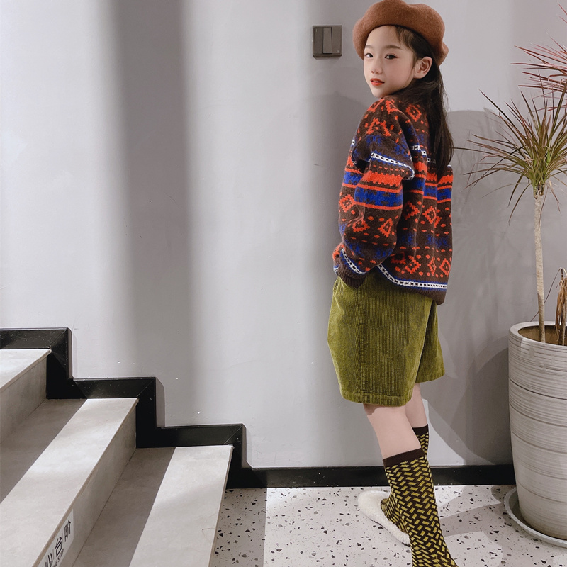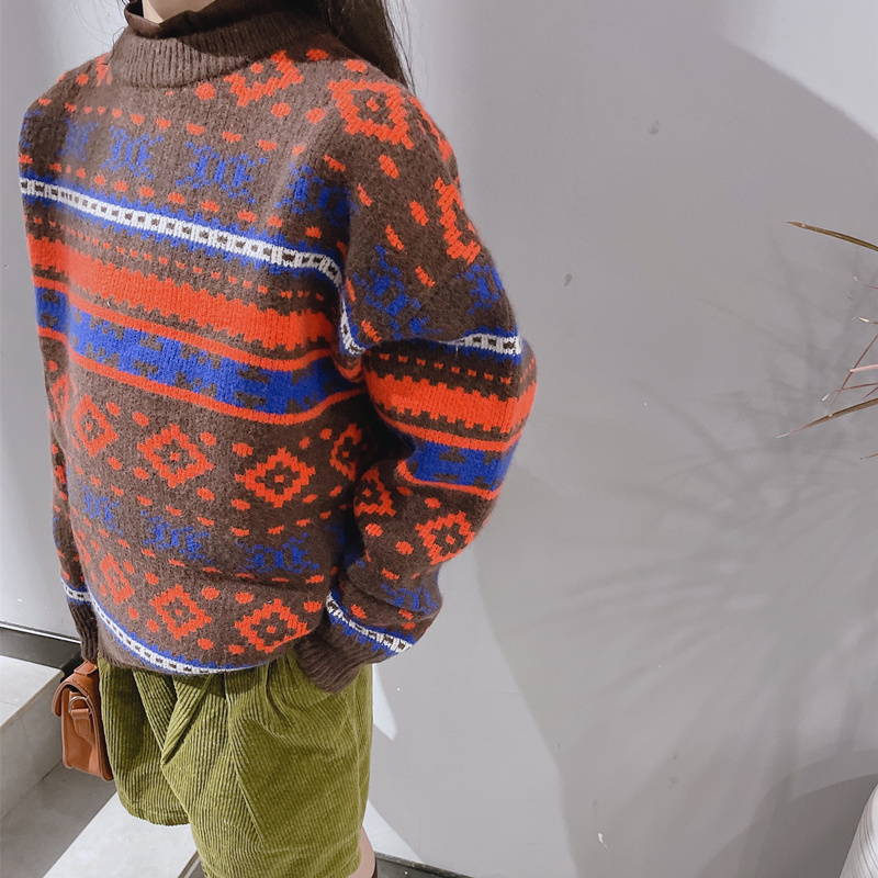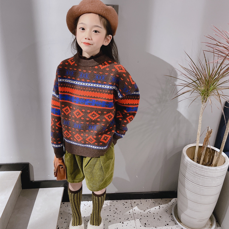 South Korean children's clothing Girls retro jacquard sweaters 2021 Winter Chinese version of the Korean version of the Korean version of the knitted sweatshirt for the boy's goat sweater