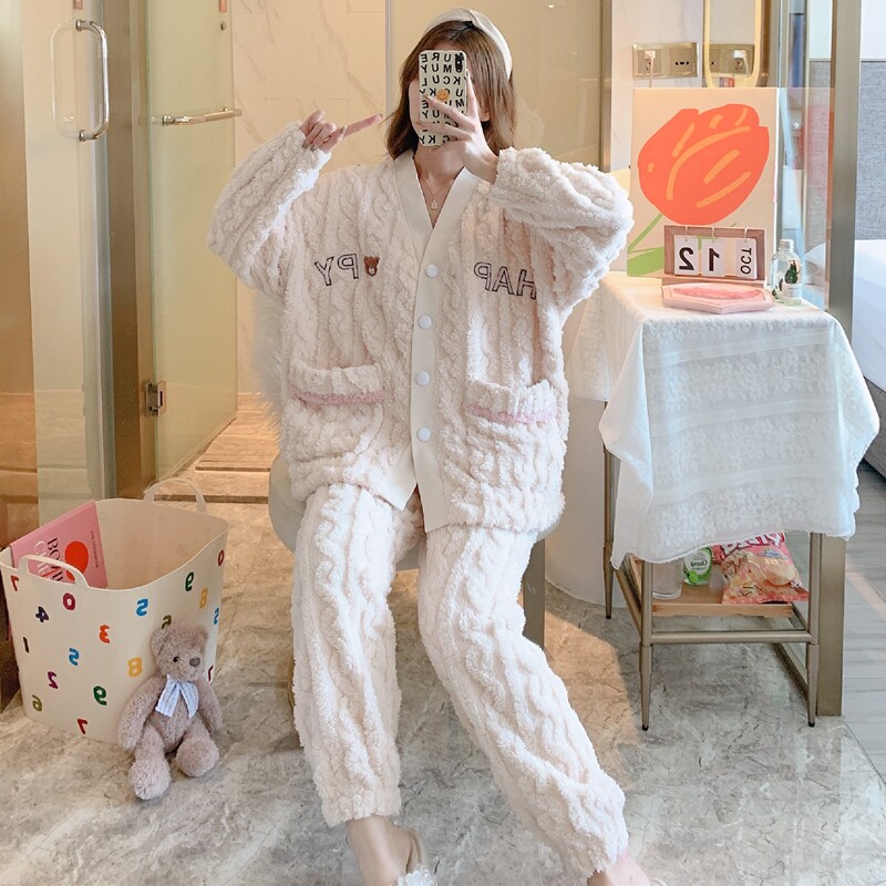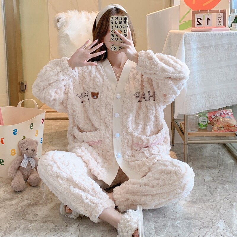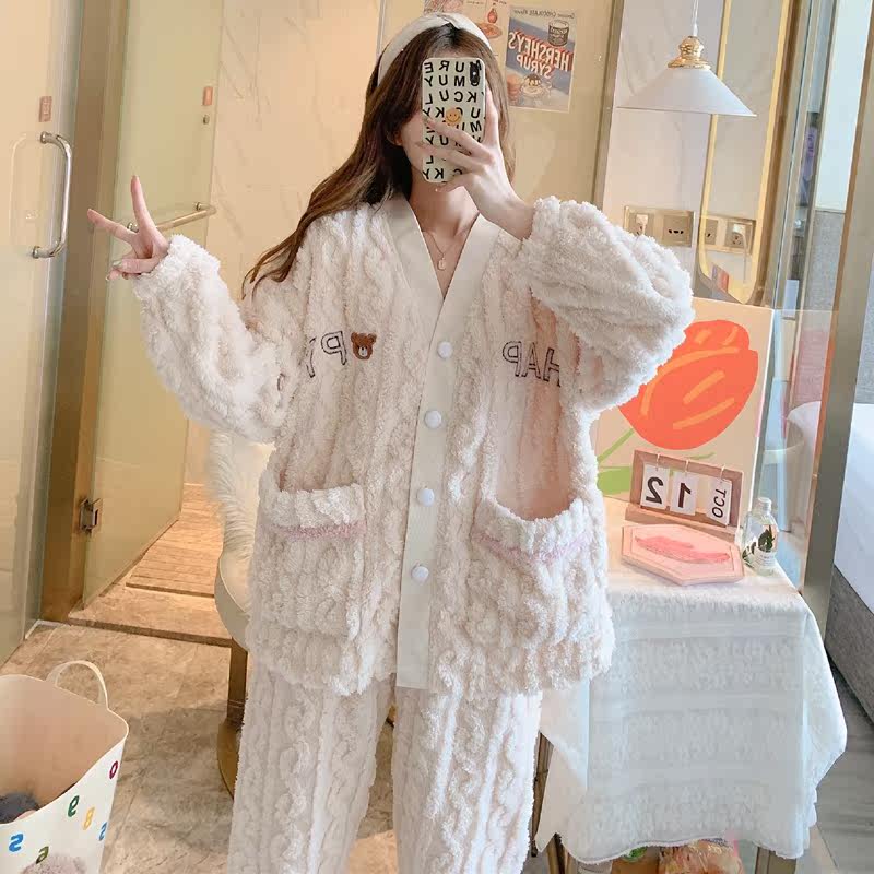 Pajamas women's autumn and winter coral fleece thickened happy bear flannel home clothes net red sweet and cute winter suit