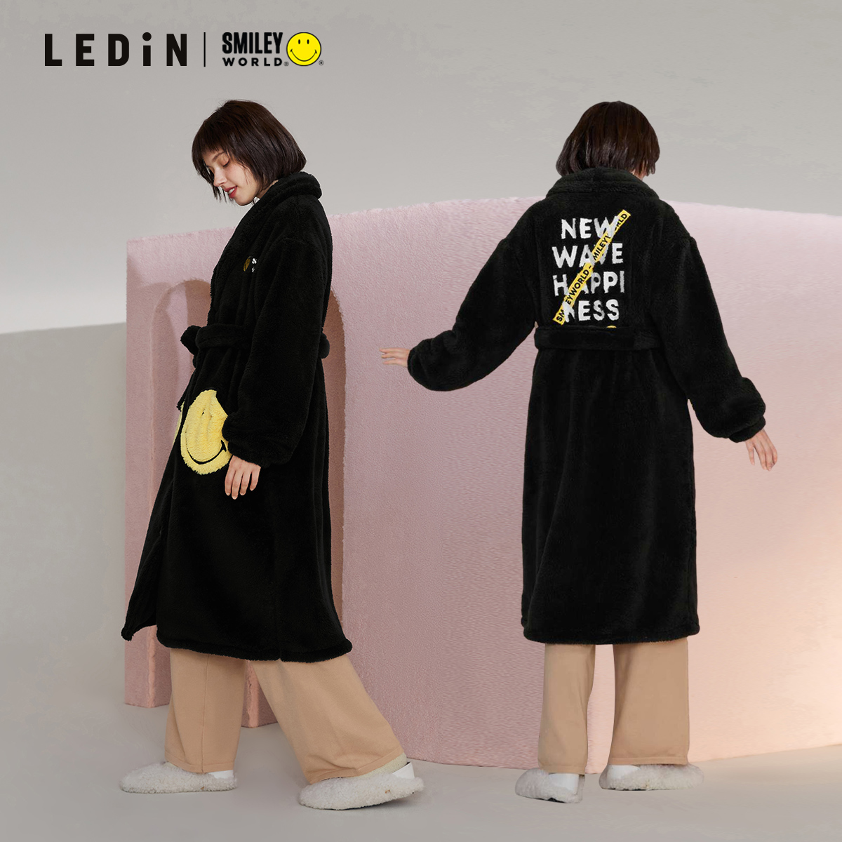 Lemachi x SMILEYWORLD ® smiley face sleeping robe women's winter cute winter style home for winter long version of coral suede