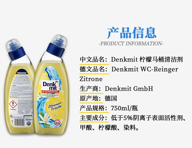 German dm Denkmit lemon scents toilet cleanser cleaning the toilet detergent descaling to remove the fungus 750ml