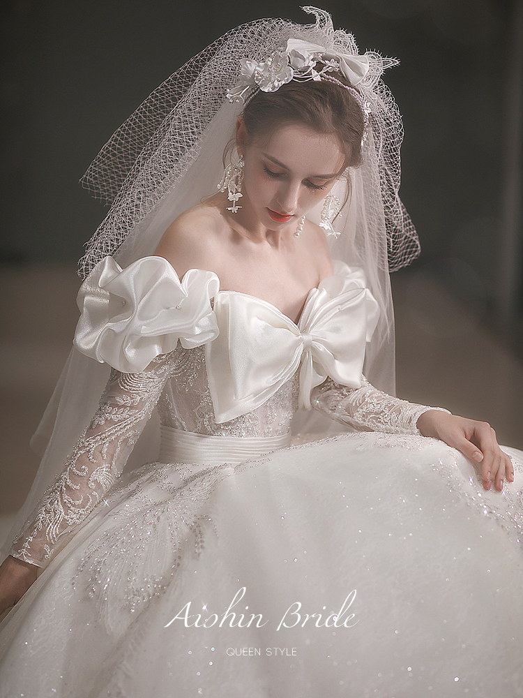 "Amber" lined with a shoulder main wedding dress 2022 new brides big trailing extravaganza Extravagant Temperament Palace Wind Long Sleeve Staple Yarn