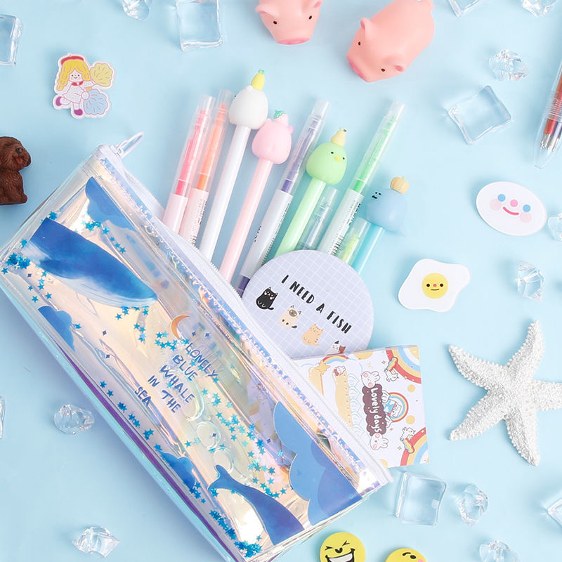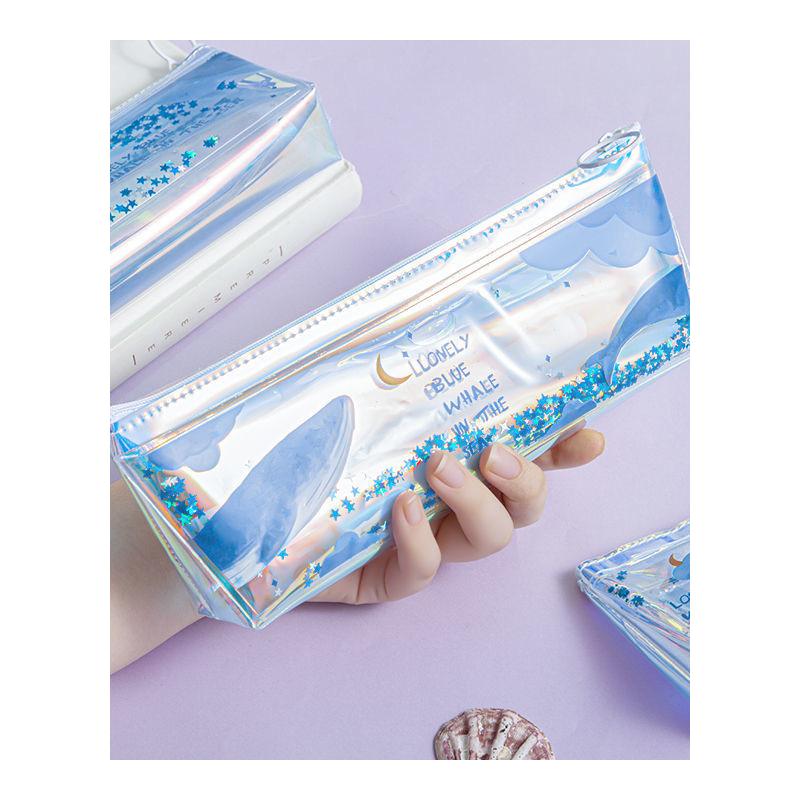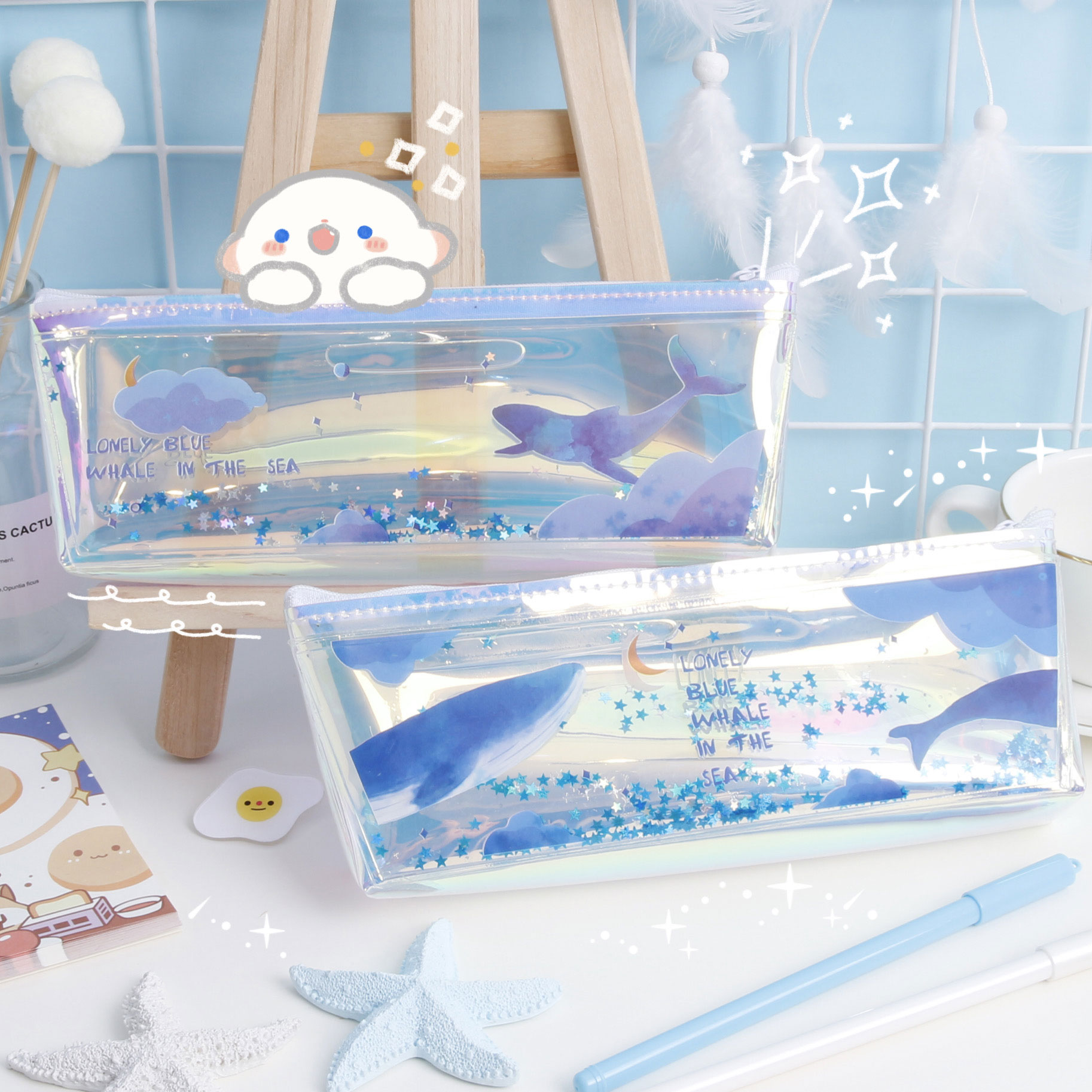 ins laser into oil blue whale pen bag pvc transparent day series flow sand stationery bag simple net red creative liquid male and female student lead pencil case large capacity cute pencil bag pen case stationery cashier bag