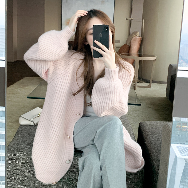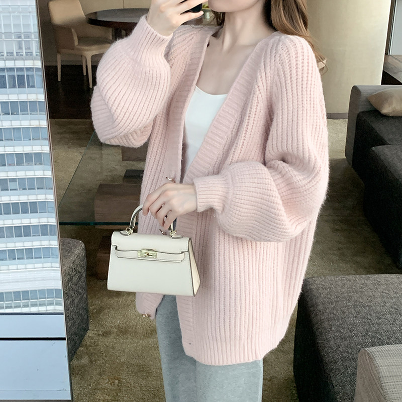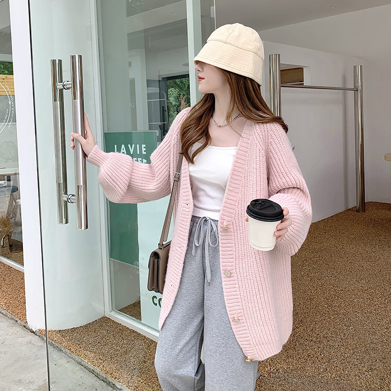 Pink sweater women's loose outerwear thickened gentle lazy wind thick line mid-length knitted cardigan coat autumn and winter