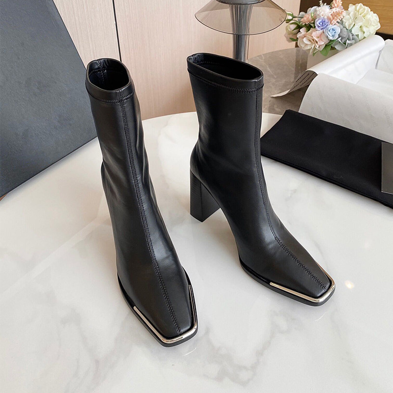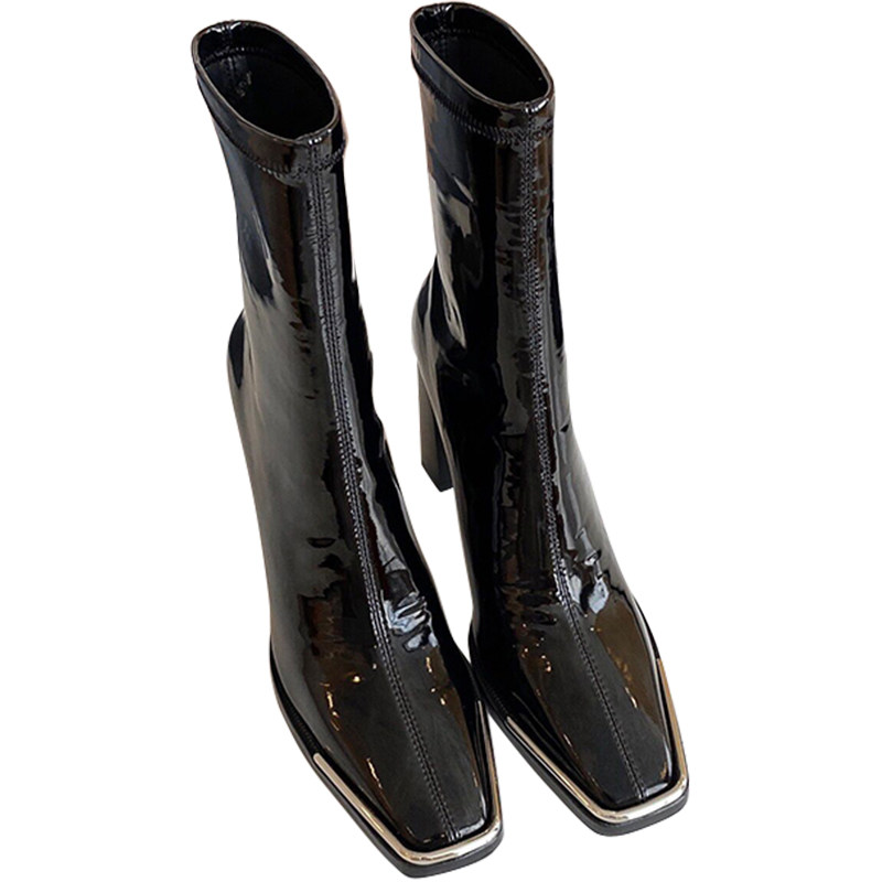 Kendou with the same metal square toe high-heeled patent leather ankle boots women's autumn 2021 new thick-heeled elastic boots skinny boots