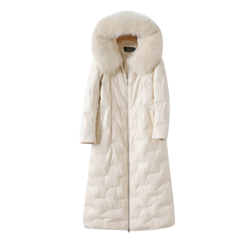 Women's Leather Down Jacket Slim Long Fox Fur Collar Hooded Haining Leather Anti-Season White Duck Down Jacket Women's Sheepskin Cotton