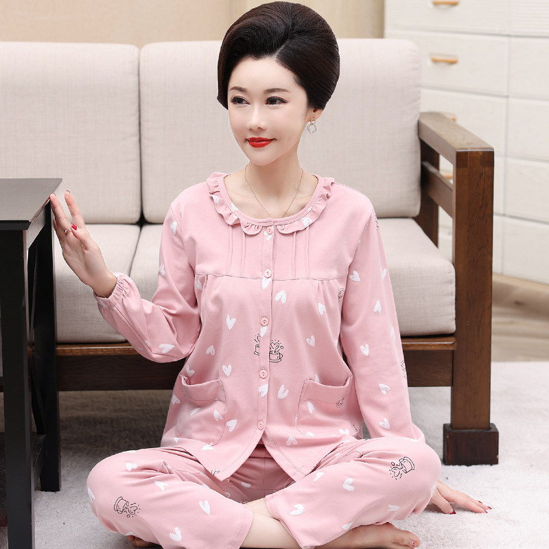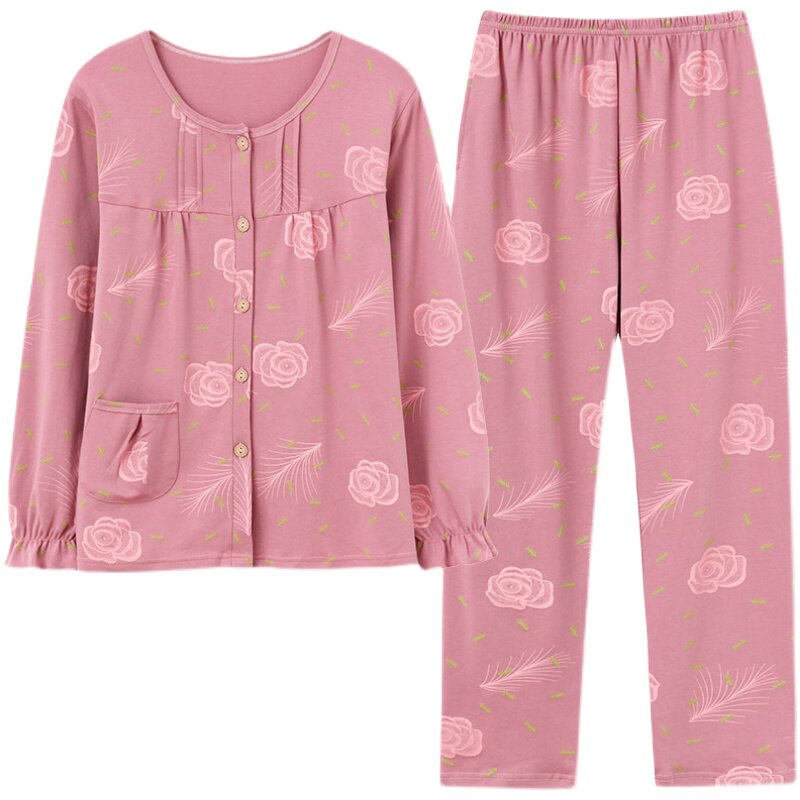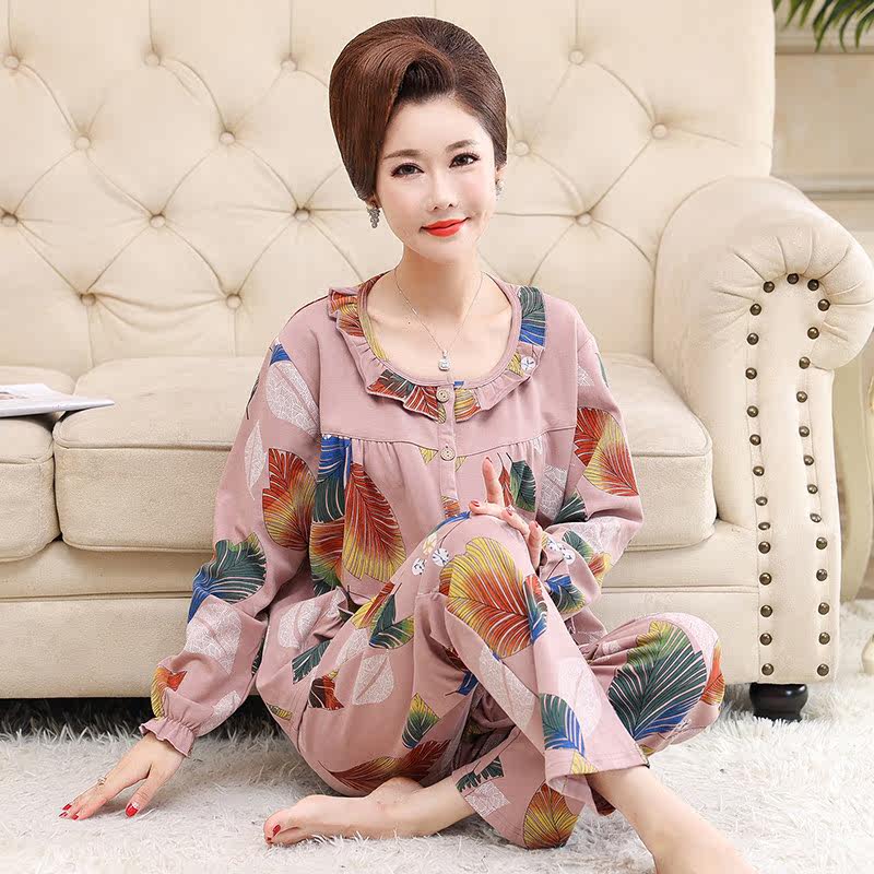 Spring autumn middle-aged lady's mother's sleepwear long sleeve pure cotton open flap jacket round collar full cotton mid-aged large size home suit suit