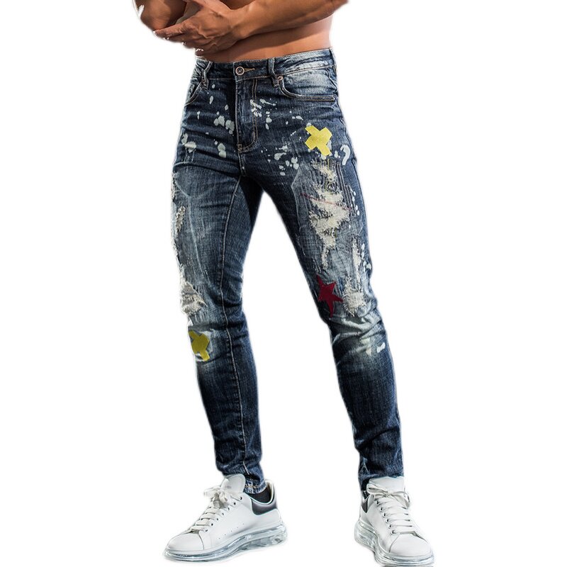 Iron wolf sports jeans men's autumn and winter elastic hole decals loose fitness muscle training cigarette pants tide