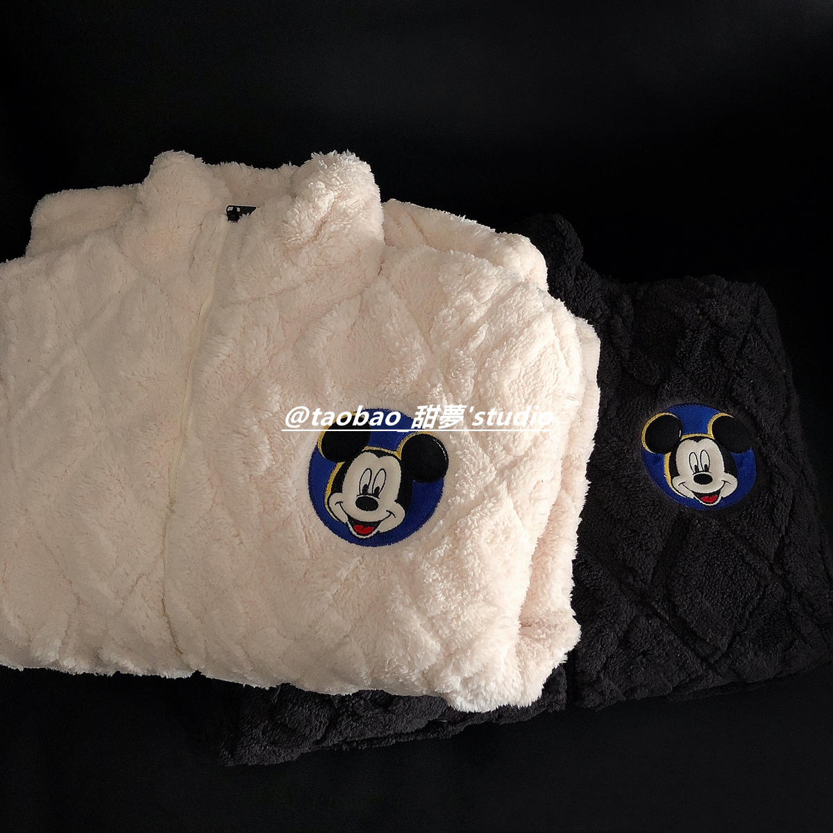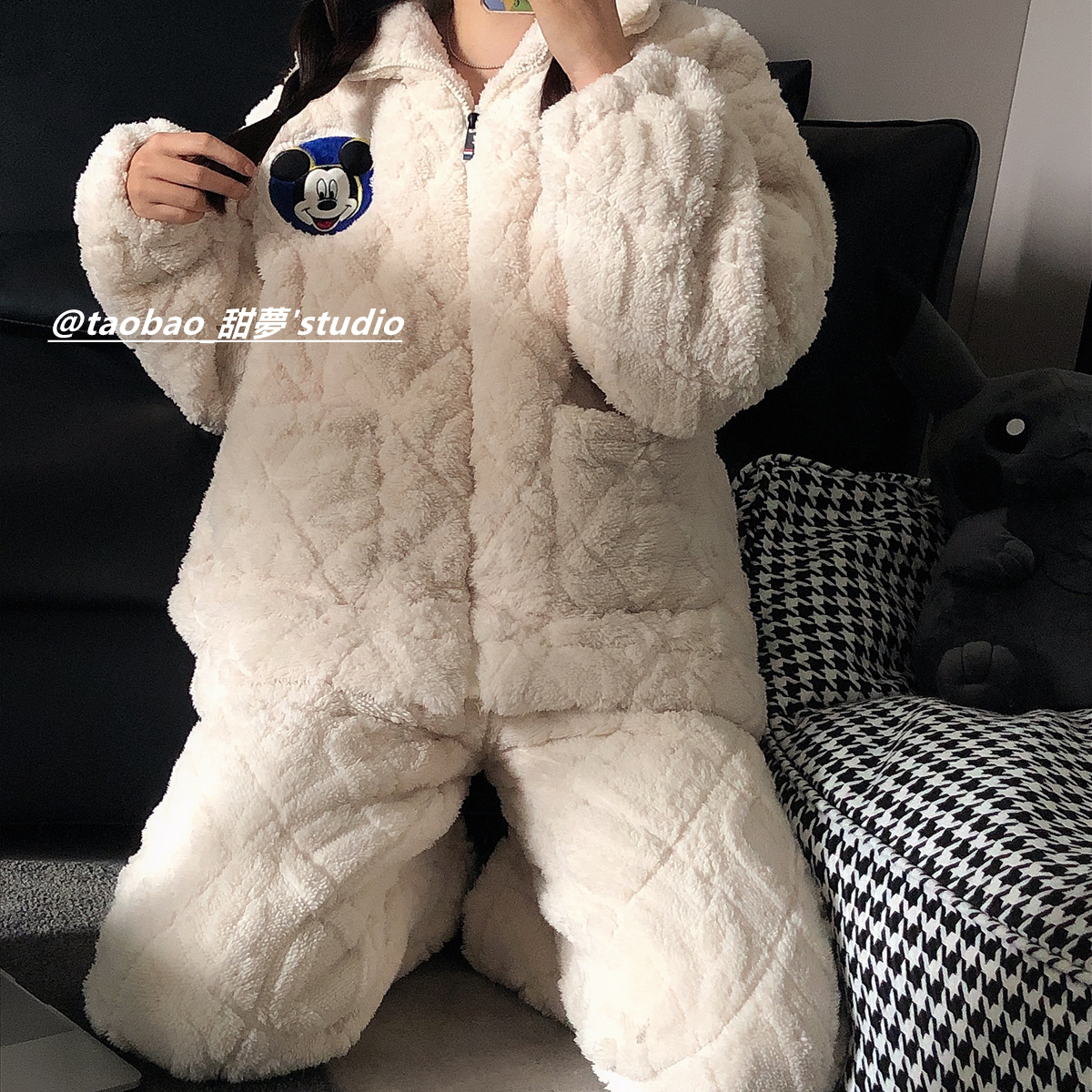 Cute Mickey series~time machine coral fleece winter pocket pajamas for men and women three-layer quilted couple home service