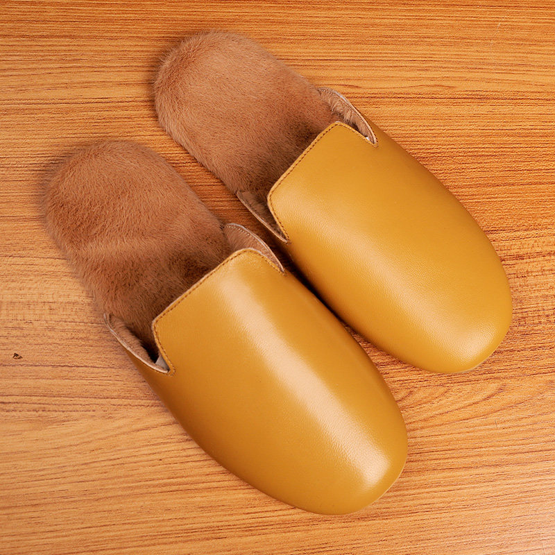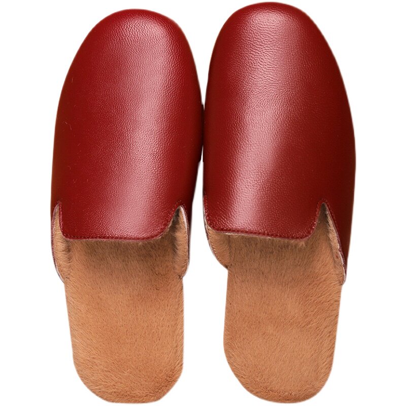 Solid Bull Gluten Bottom Leather Slippers Winter Home Genuine Leather Indoor Women Cashmere Wool Slippers Plus Suede Warm Office Fashion