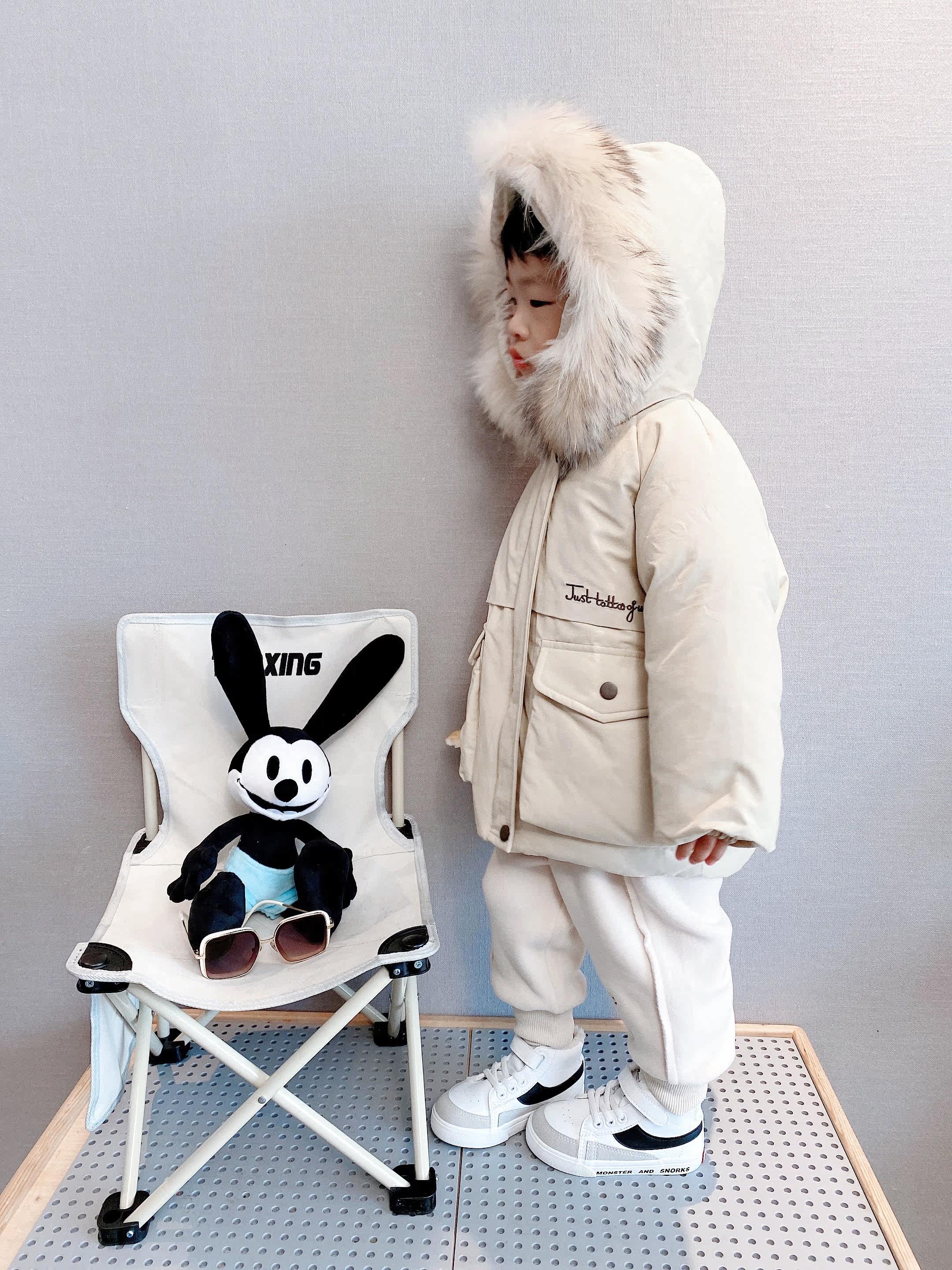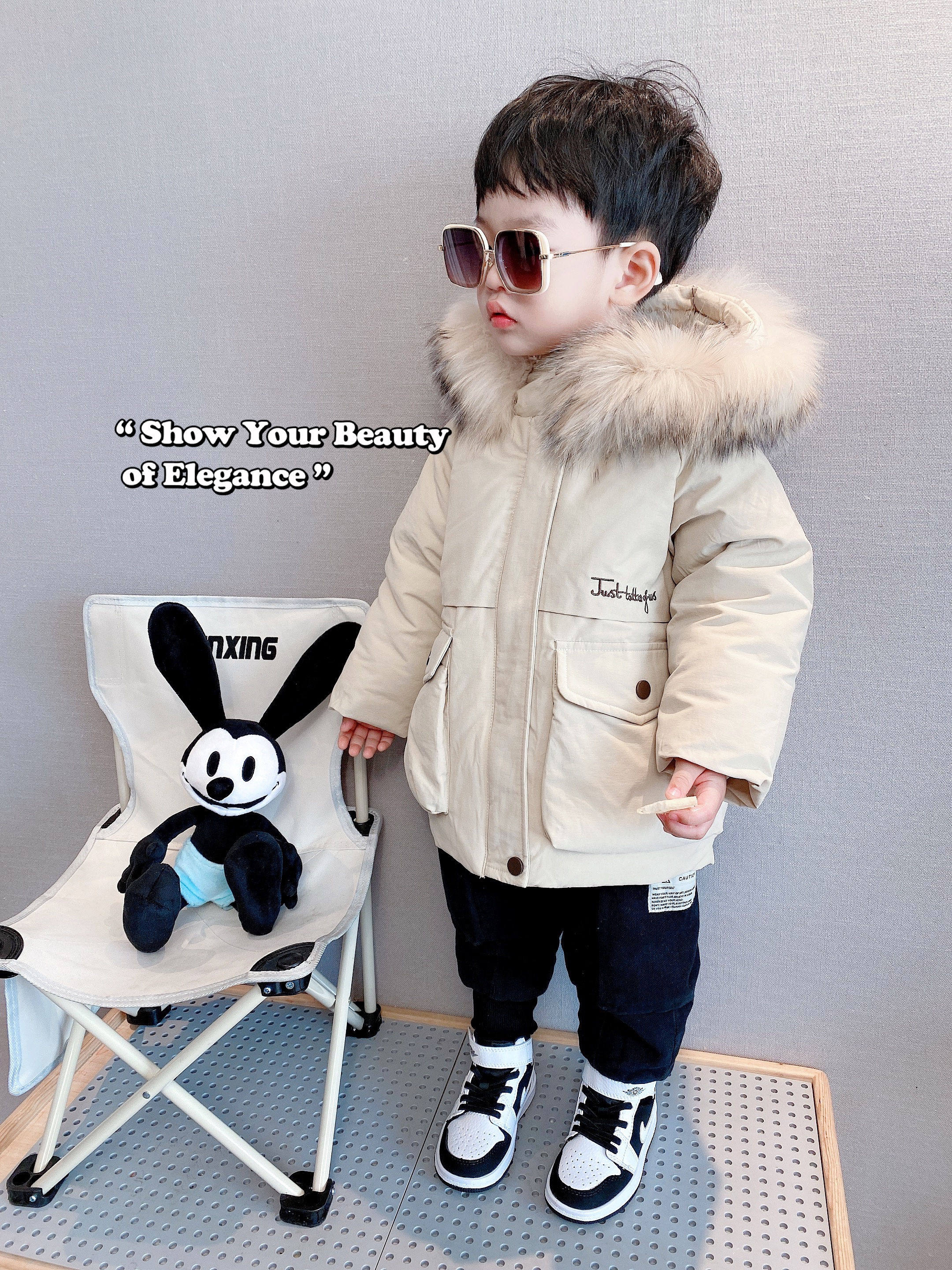 (raccoon fur hooded down jacket) children's winter warm parka down mid-length version 90 white duck down jacket top
