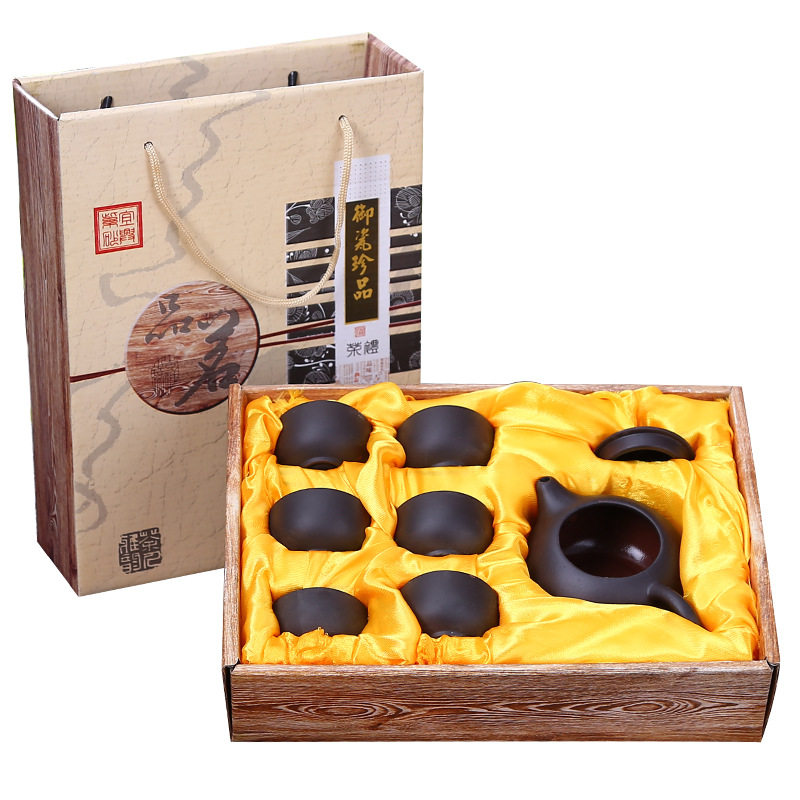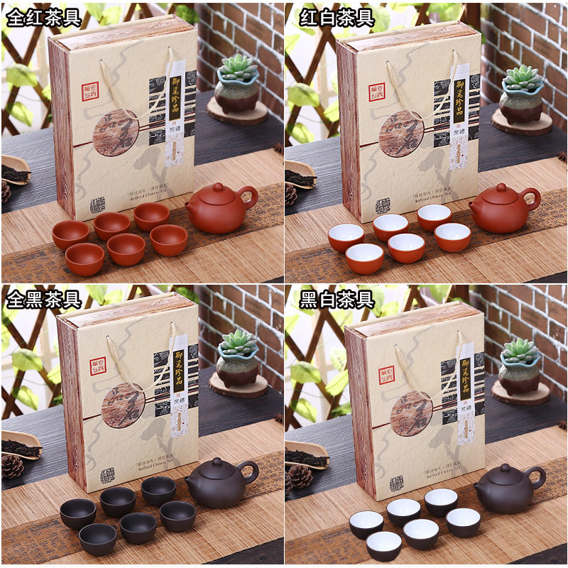 (gift box 1) all black 4 cups 1 pot with brocade box (gift box 2) all red 4 cups 1 pot with brocade box (gift box 3) black and white 4 cups 1 pot with brocade box (gift box 4) red and white 4 cups 1 pot