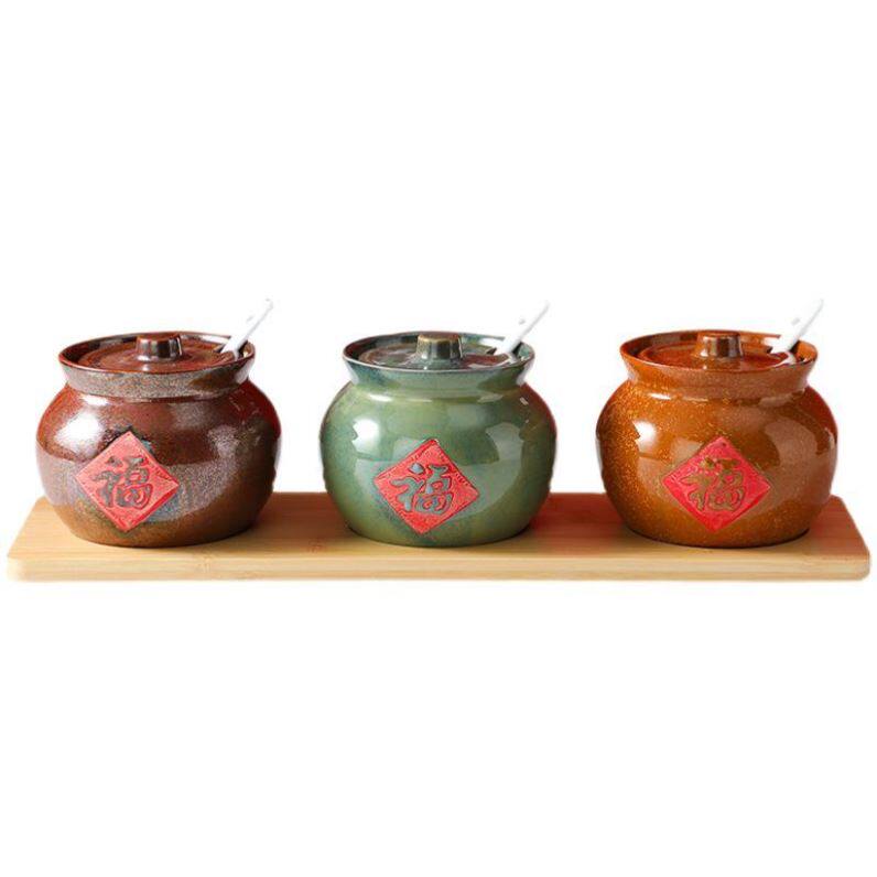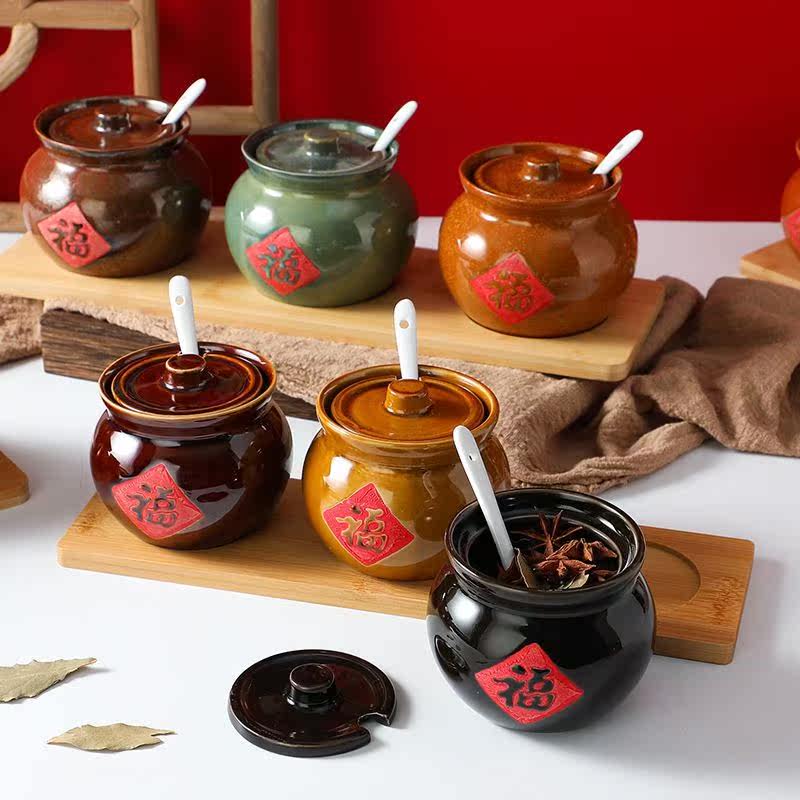 Oil splash hot sub-tank pig oil tank with spoon salt tank ceramic oil chili canned pig oil tank high temperature resistant seasoning tank tile cylinder