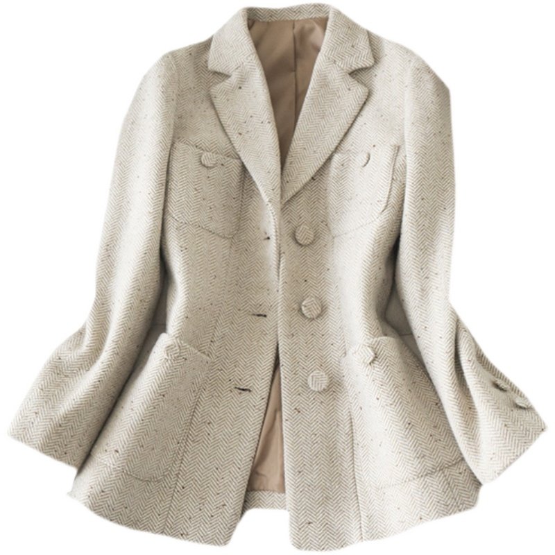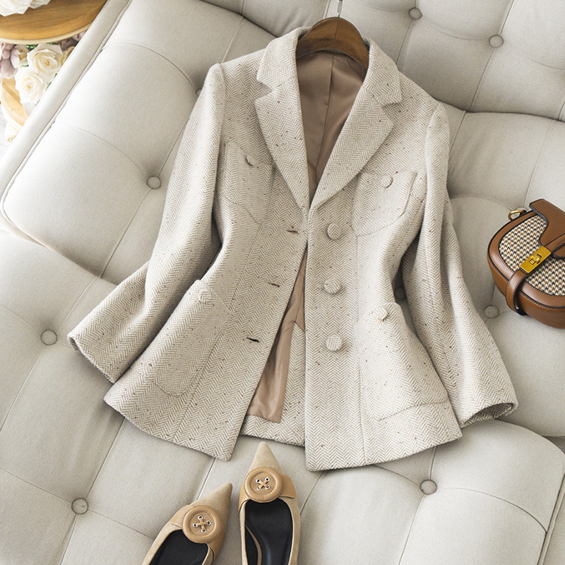 Day Ensemble Herringbone Textured Wool Suit Jacket Woman Spring Autumn Harvest Waist High-end Rice White Wool Temperament Casual Little West Suit