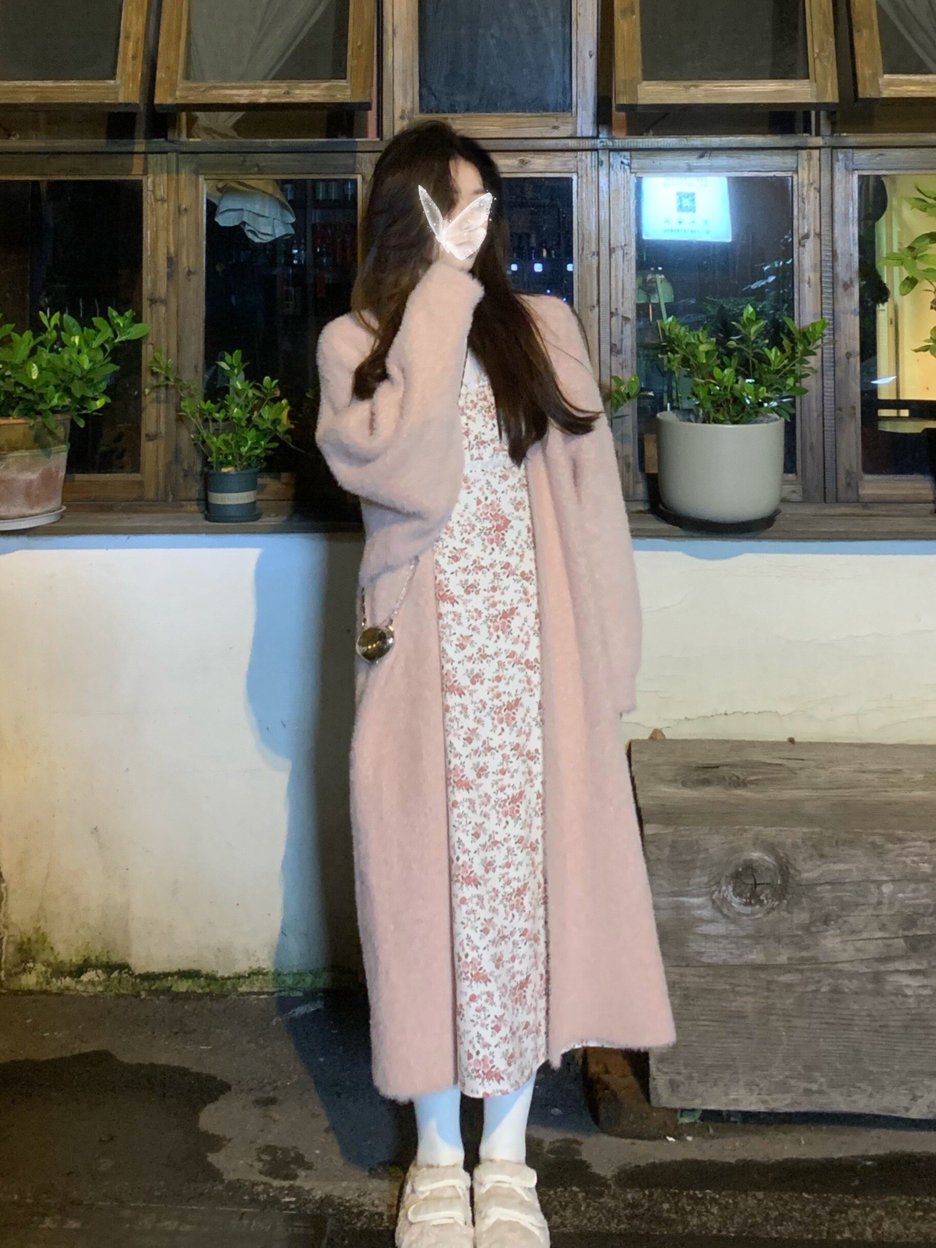 A sweet peach yikett winter chapter cherry blossom agreement mink velvet mid-length sweater knitted cardigan coat women's autumn