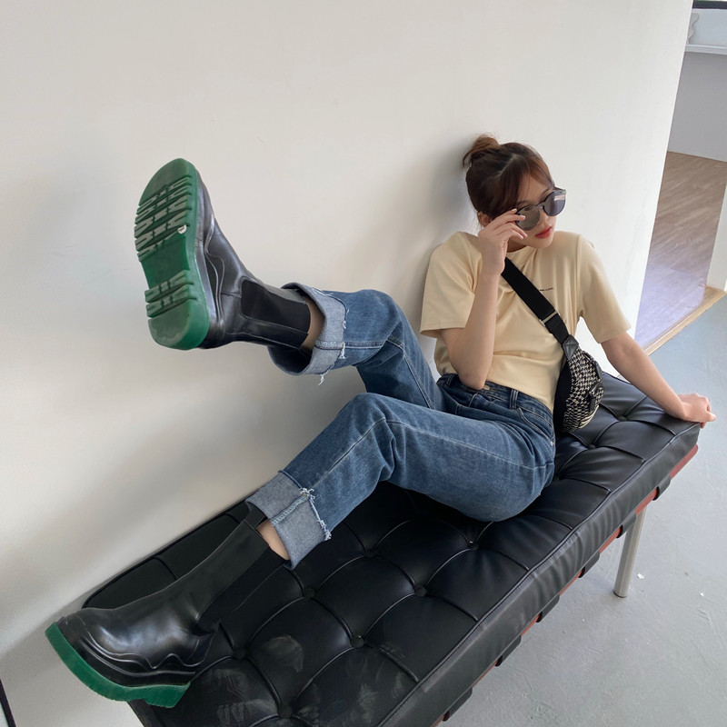 Lengthened 175 jeans tall women's retro double buckle high waist flanging elastic straight pipe nine-point pants autumn and winter
