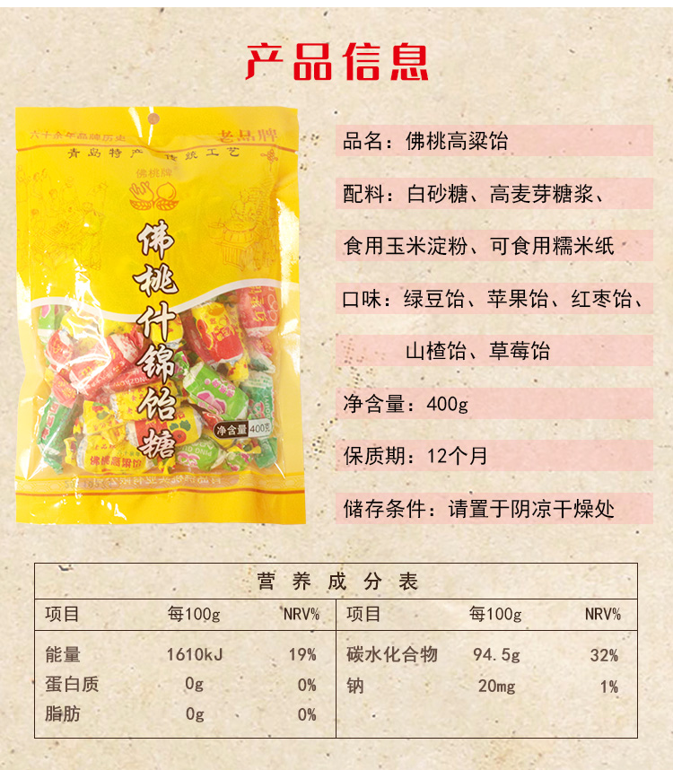 Qingdao specialty Fo Tao brand sorghum rao traditional brushed sorghum rao old brand 400g six flavors mixed