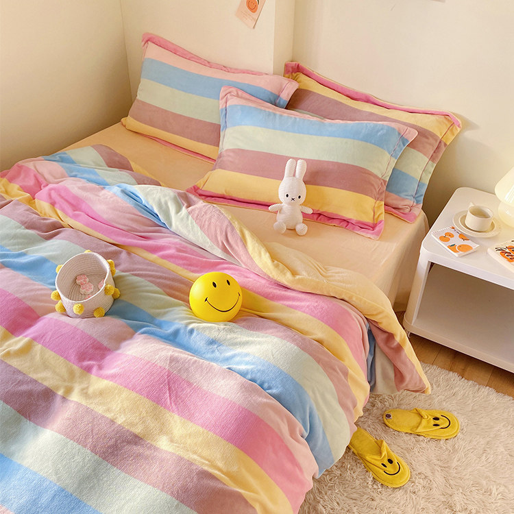 (Home Pose) Milk Suede Winter Warm Rainbow Oxygen Double Bed Goods Four Pieces BJ Sheet Quilt Cover