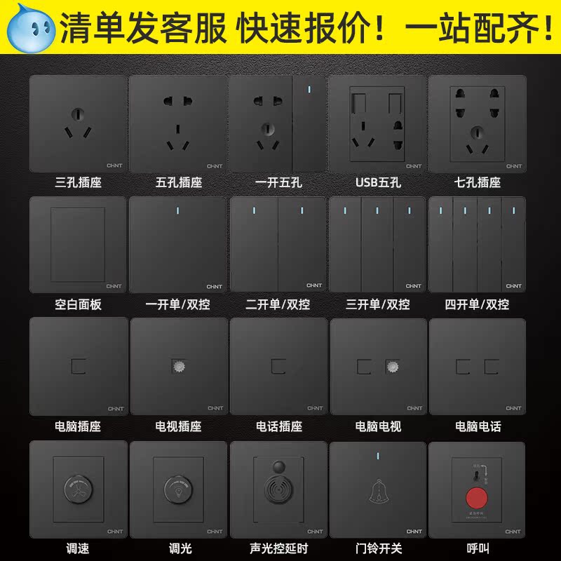 Positive five-hole socket Oblique five-hole socket One open single control One open double cut Two open single control Two open double cut Three open single control Three open double cut Four open single control Four open double cut Doorbell switch One open more