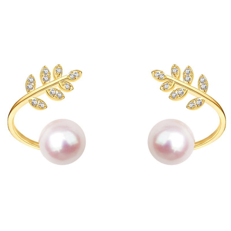 Pure Silver Plated Real Gold Ear Needle Advanced Sensation Solid Leaves Positive Round High-quality Natural Pearl Earrings Woman Gentle Elegance