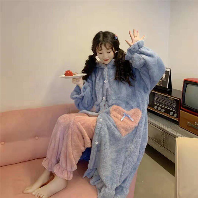 Korean version of autumn and winter coral fleece pajamas women's suit students cute plus velvet thickened ins nightgown nightdress home service
