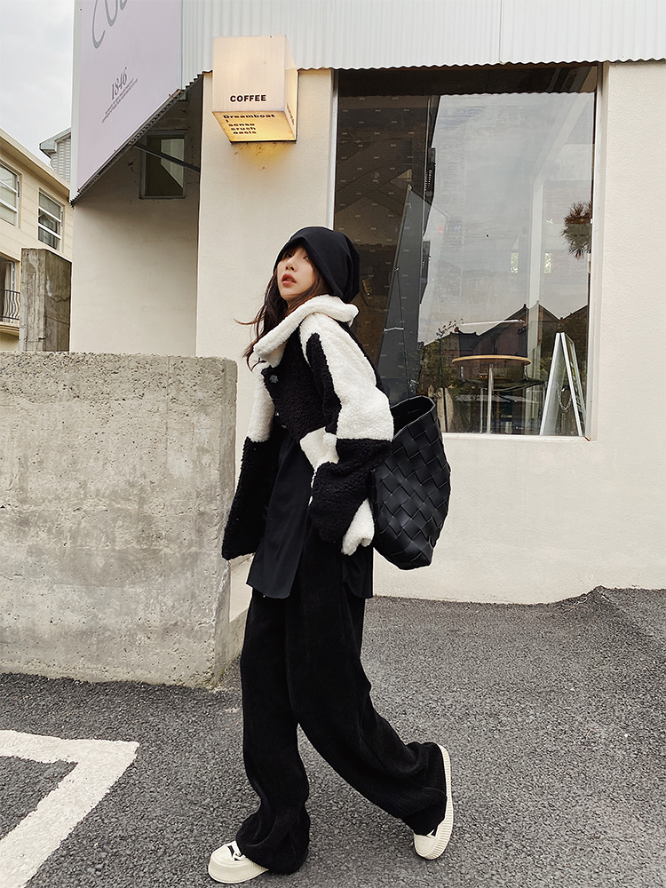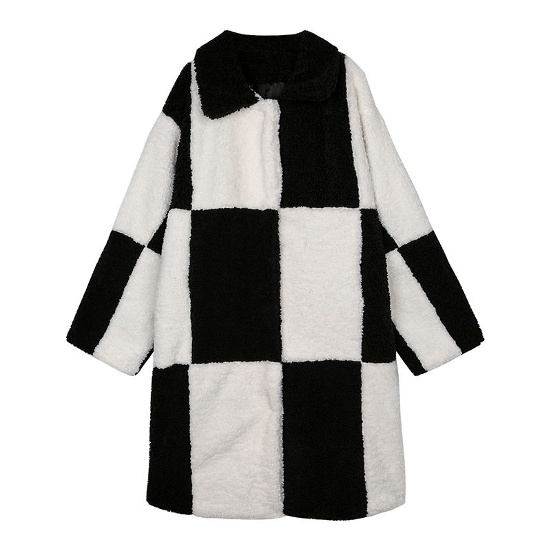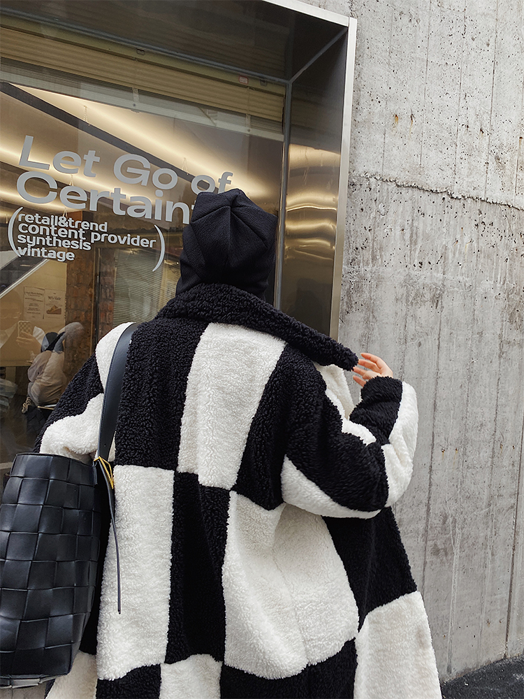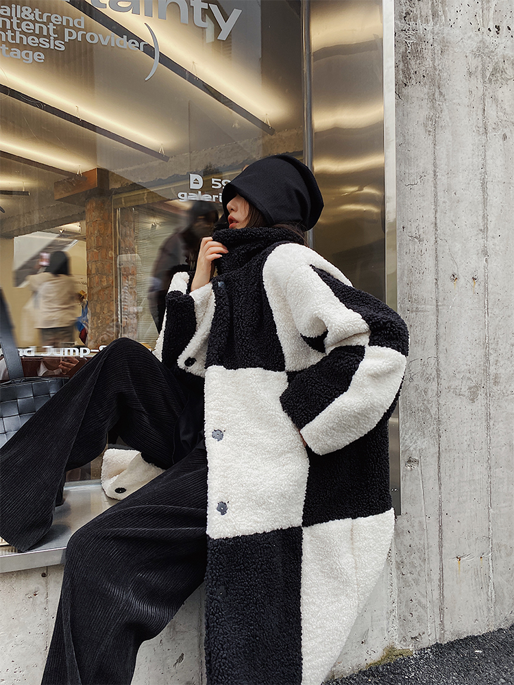Xiao Nian Custom Checkerboard Lamb Coat Women's Fall/Winter Long Short Fur Black and White Plaid Coat