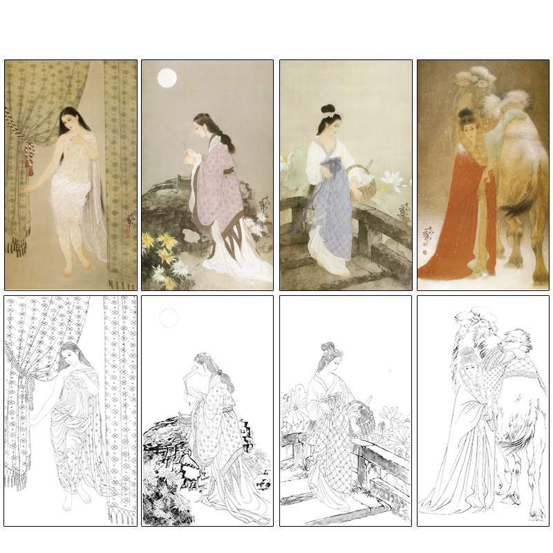 He Jiaying's four beauties, meticulous paintings, drafts, modern characters, women, physical prints, a set of four Q029