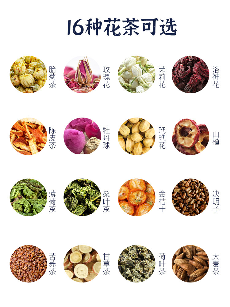 Rose, roselle, jasmine, peony, chrysanthemum, tangerine peel tea, etc.