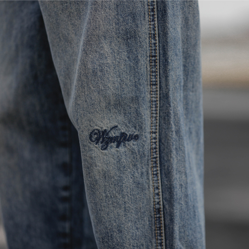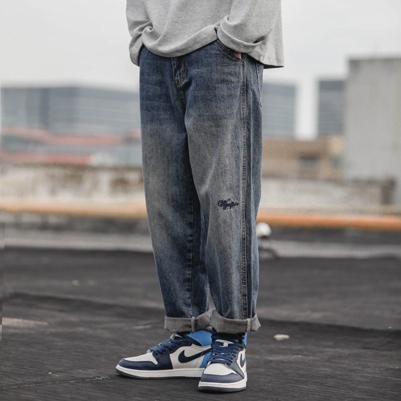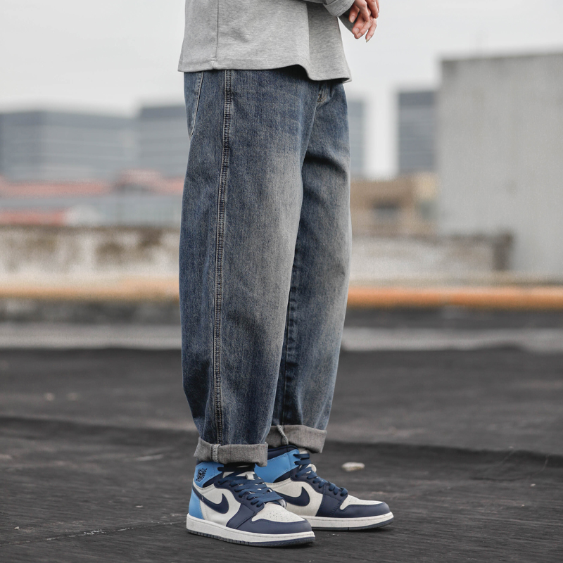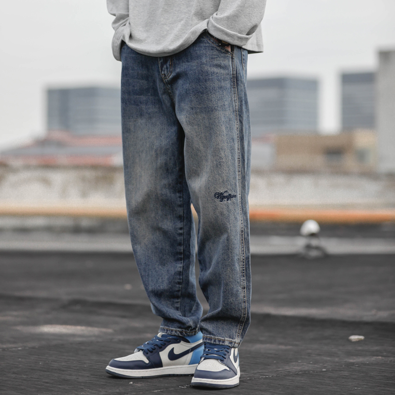Retro jeans Men's washed up for old boomers Spring and autumn season Japanese Loose Straight Barrel Casual Broadleg Deep Blue Long Pants