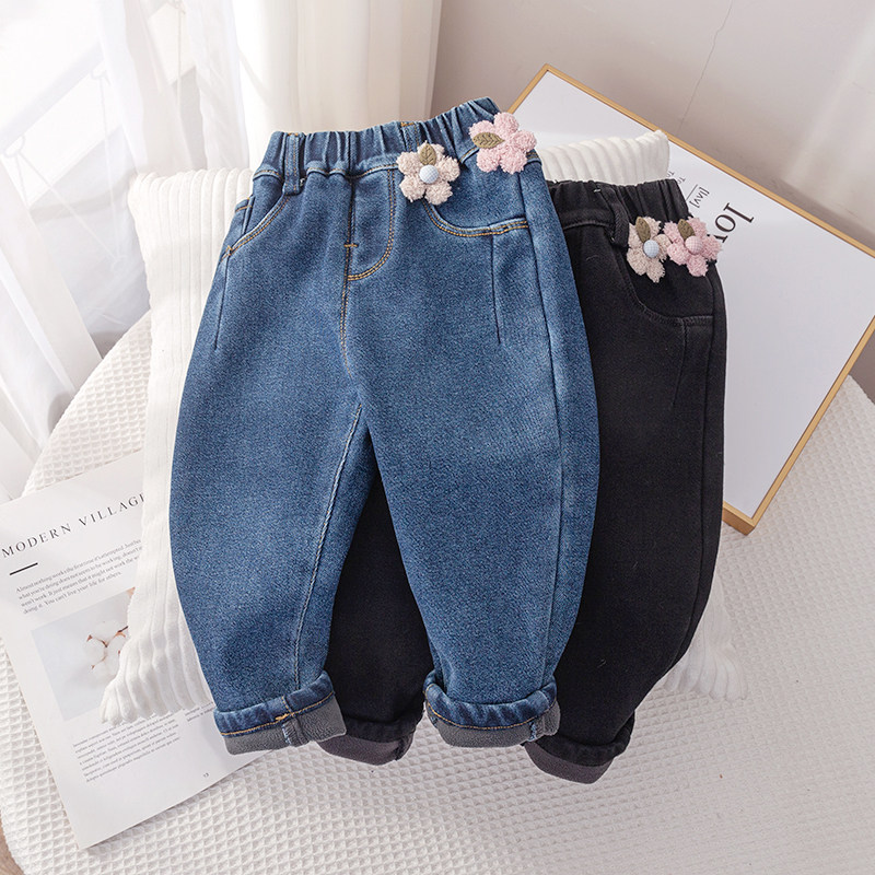 Female Baby Work Pants Flowers Long Pants Baby Harun Pants Autumn Winter Clothing Girl Thickening Gapped Jeans