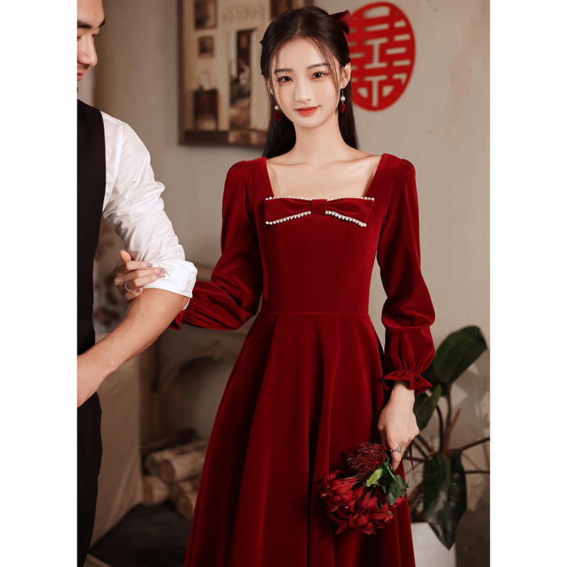 Velvet toast dress bride small man dress usually can wear long-sleeved burgundy engagement back door dress skirt woman