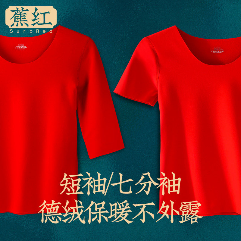 Red velvet short-sleeved men's winter warm t-shirt wedding bottoming shirt no trace velvet three-quarter sleeves natal rabbit year