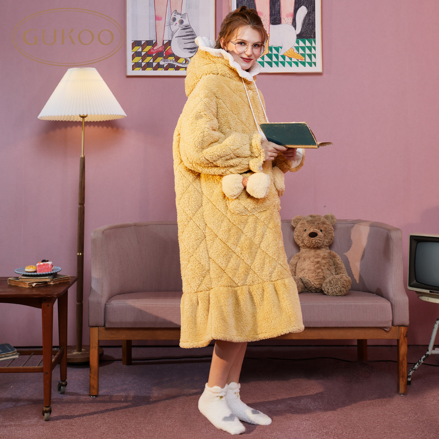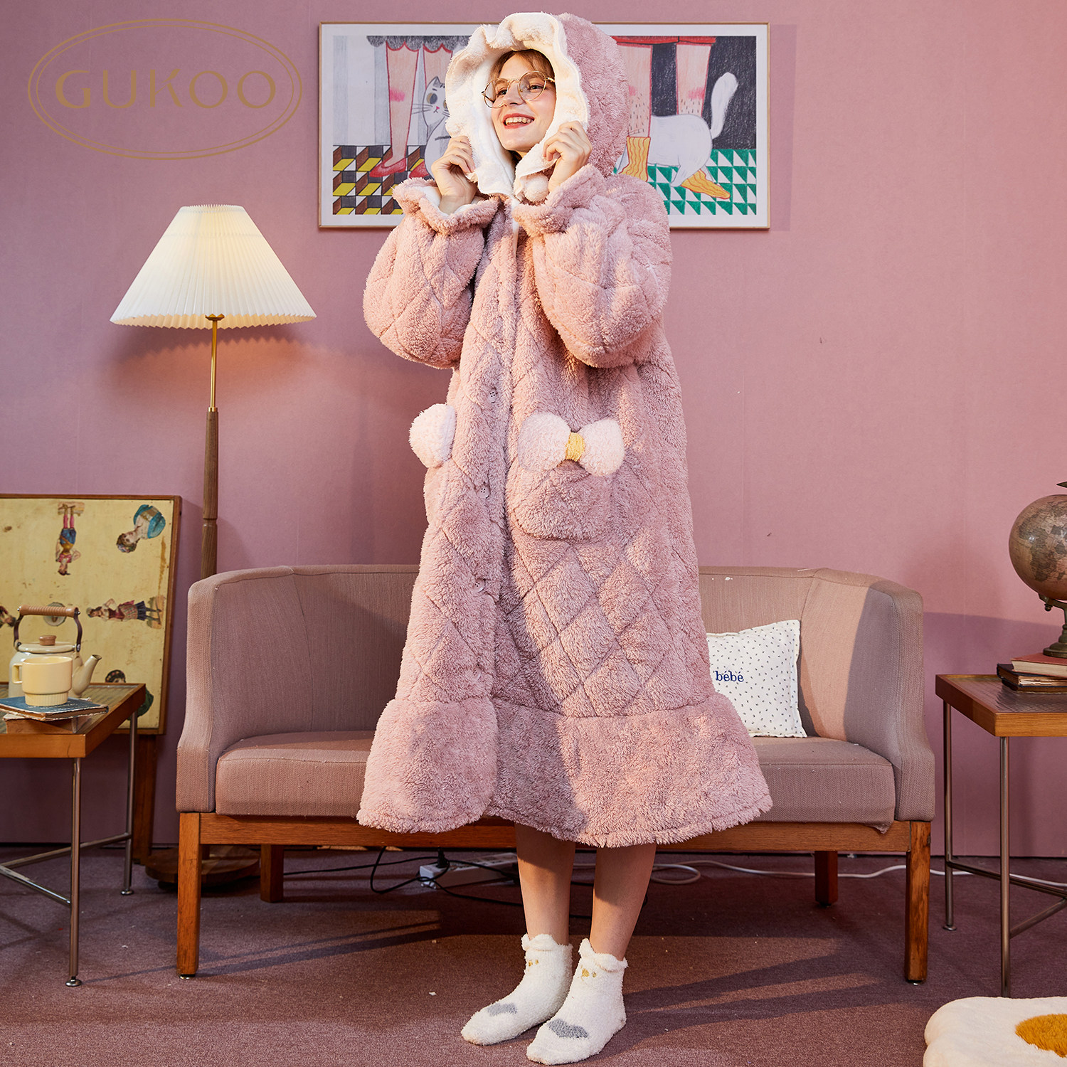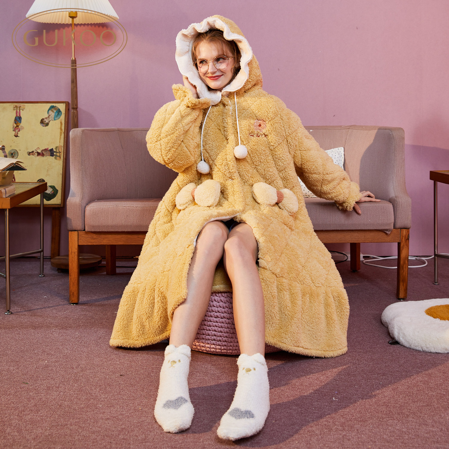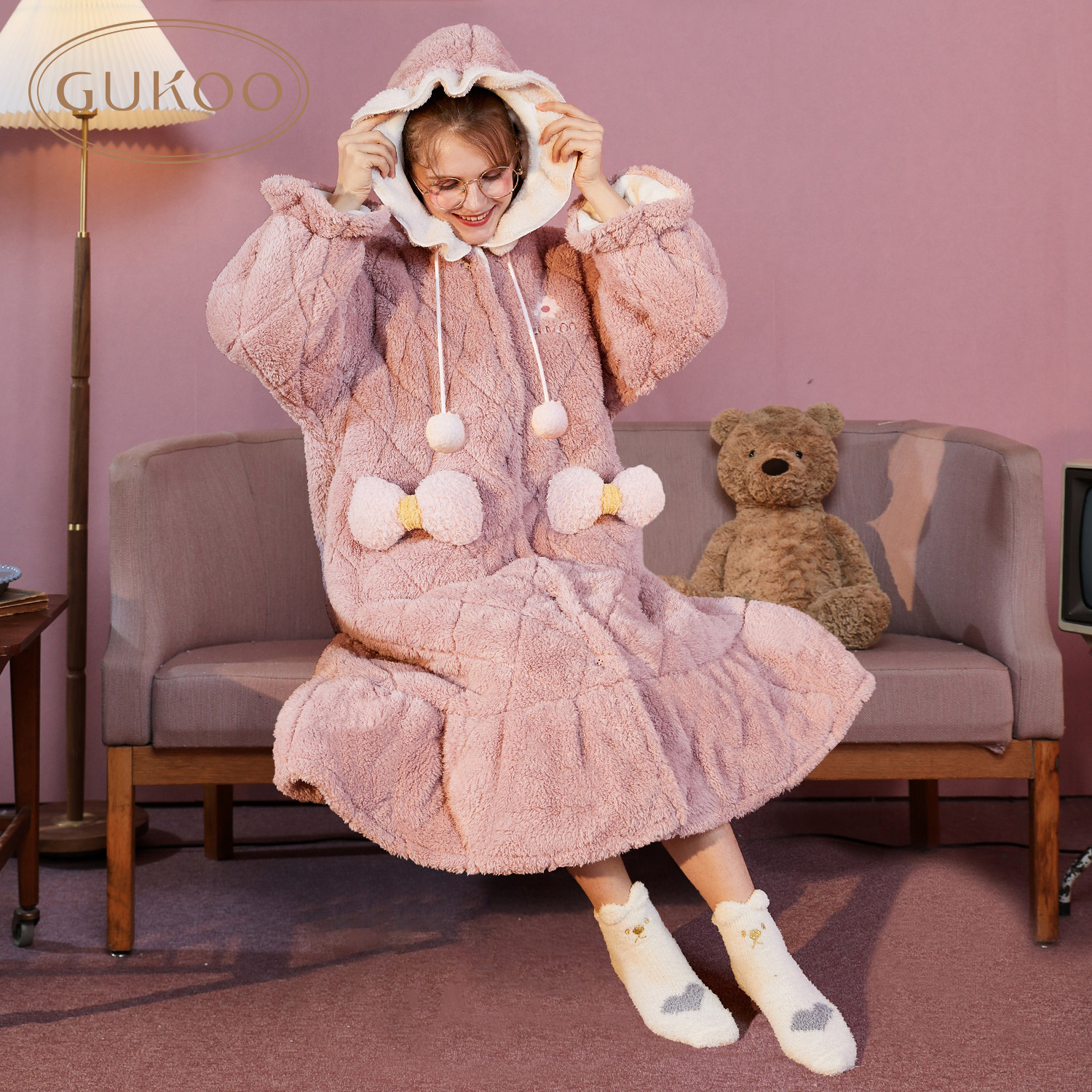 Gukoo Fruit Shell Sleeping Robes Women's Winter Coral Suede Pajamas Butterfly Knots Pyjamas Women's Hat Clips Cotton Sleeping Dresses Thickened Warmth