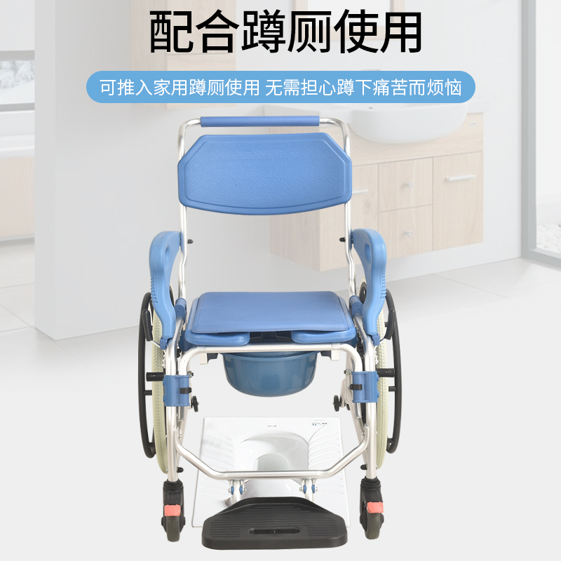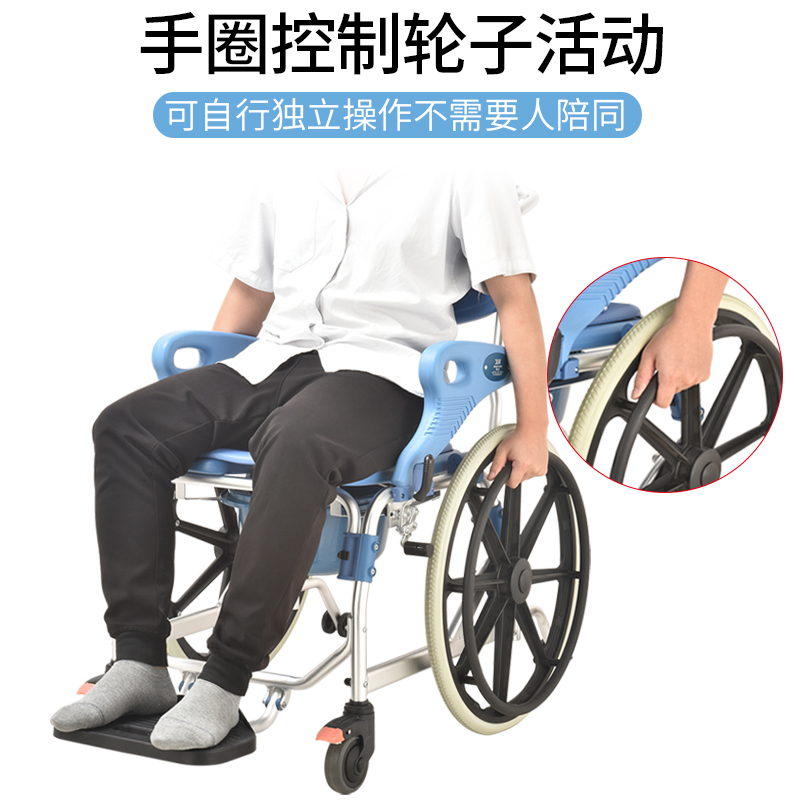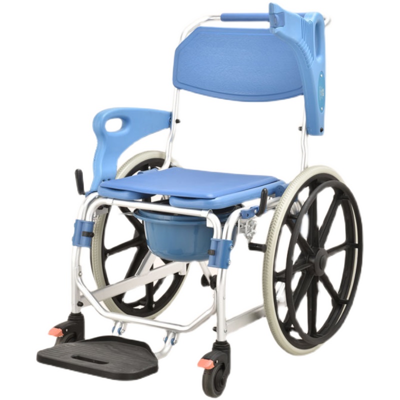 The left and right armrests of the 698B large-wheeled toilet chair can be turned over by 698A four-wheel with brake.