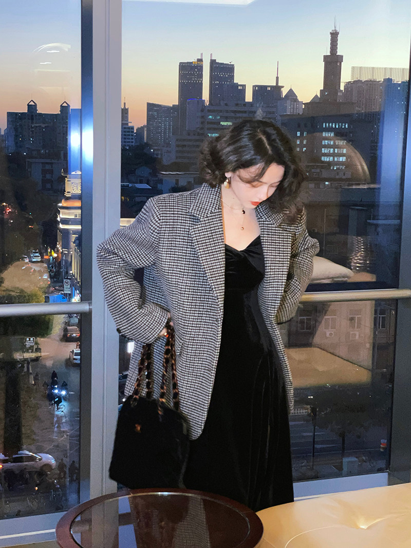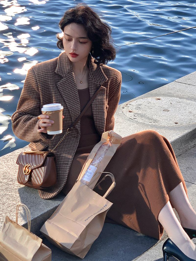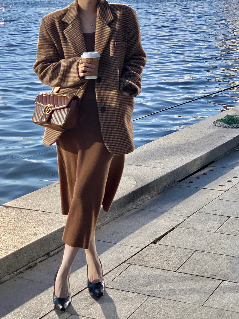 Wine-in-the-afternoon style retro autumn and winter gig wool curly wool curry suit Spring paragraph Loose Conspicuge-Striped Suit Jacket Woman