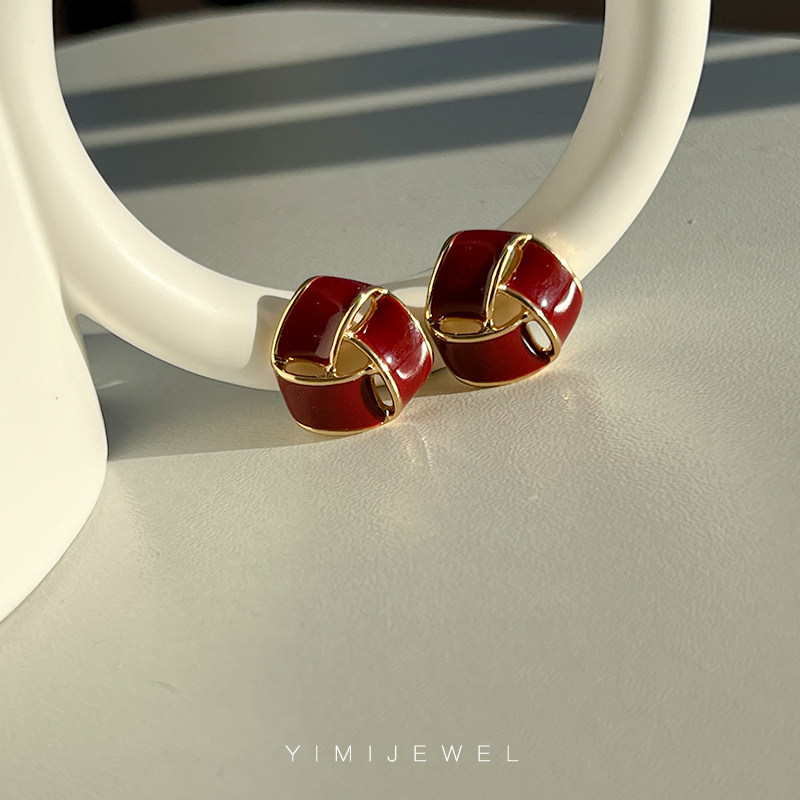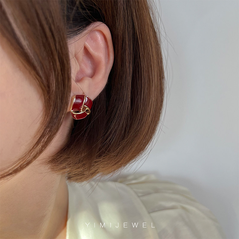 YIMIJEWEL Year of the Tiger Hong Kong Style Retro New Year Wine Red Ear Clip Female No Pierced French Temperament 925 Silver Earrings