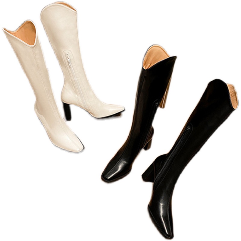 White though kneecap with long boots woman 2021 Winter new square head side pull chain slim stretch boots high cylinder women's boots