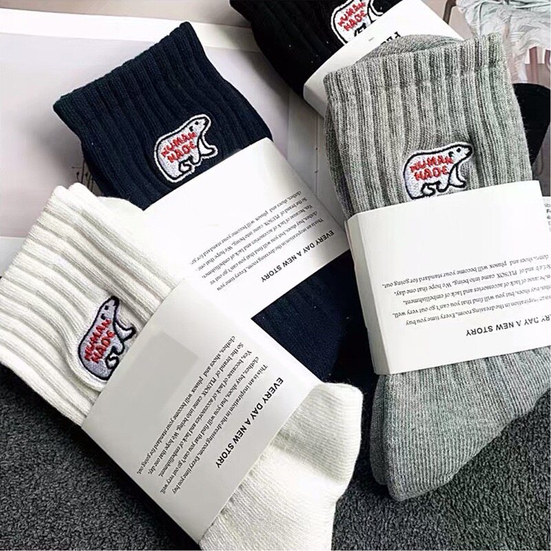 (3 Pairs) Polar Bear Embroidered Cartoon Pattern Middle Tube Towel Bottom Perspiration Jacquard Solid Color Sports Socks