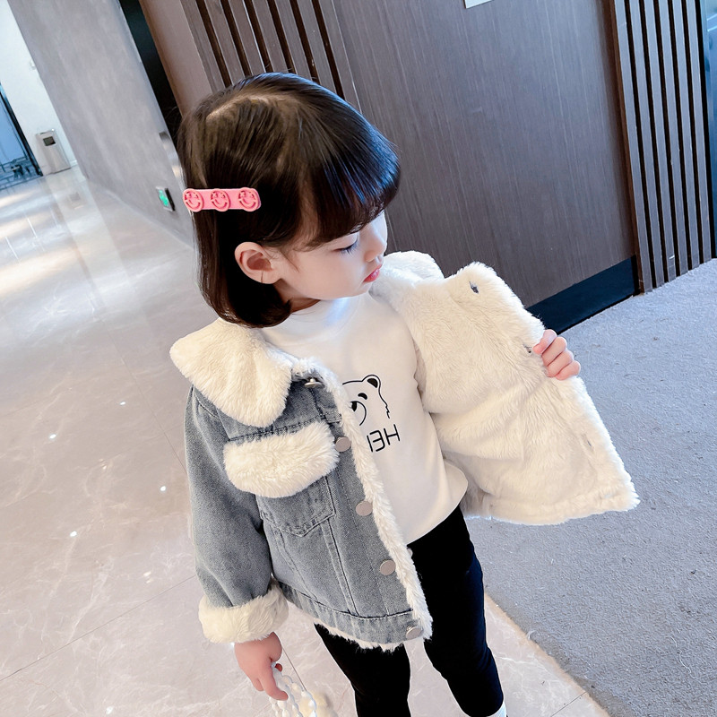OKAIDI French girl plus velvet thick autumn and winter western style denim jacket baby Korean version princess top casual