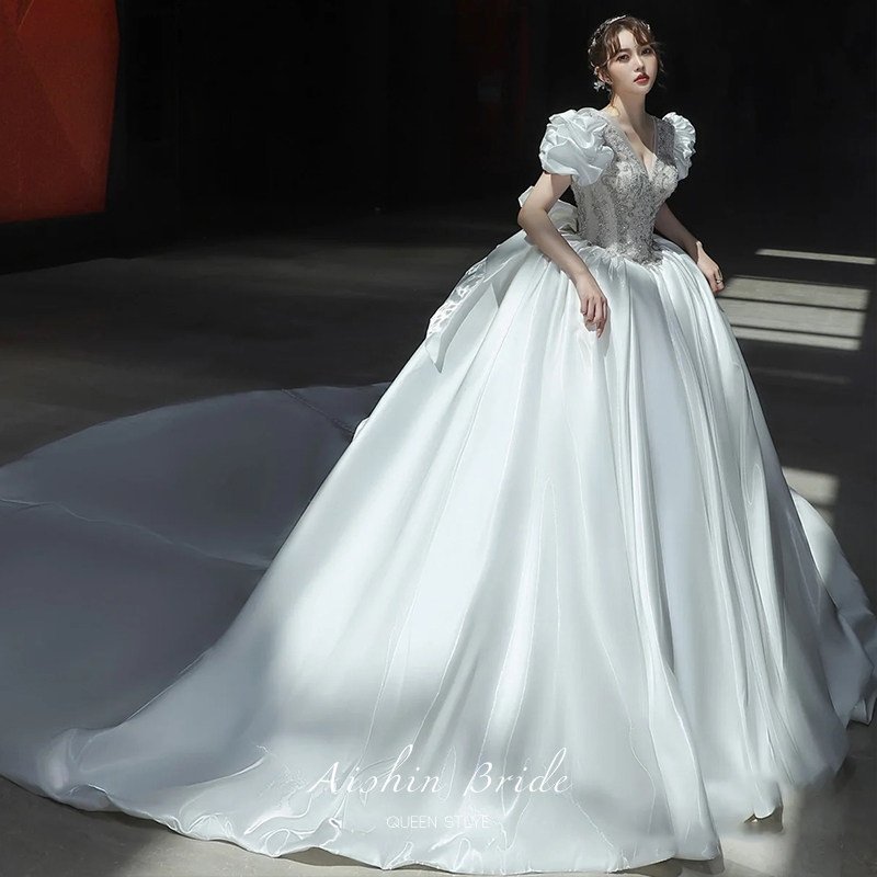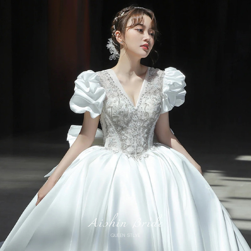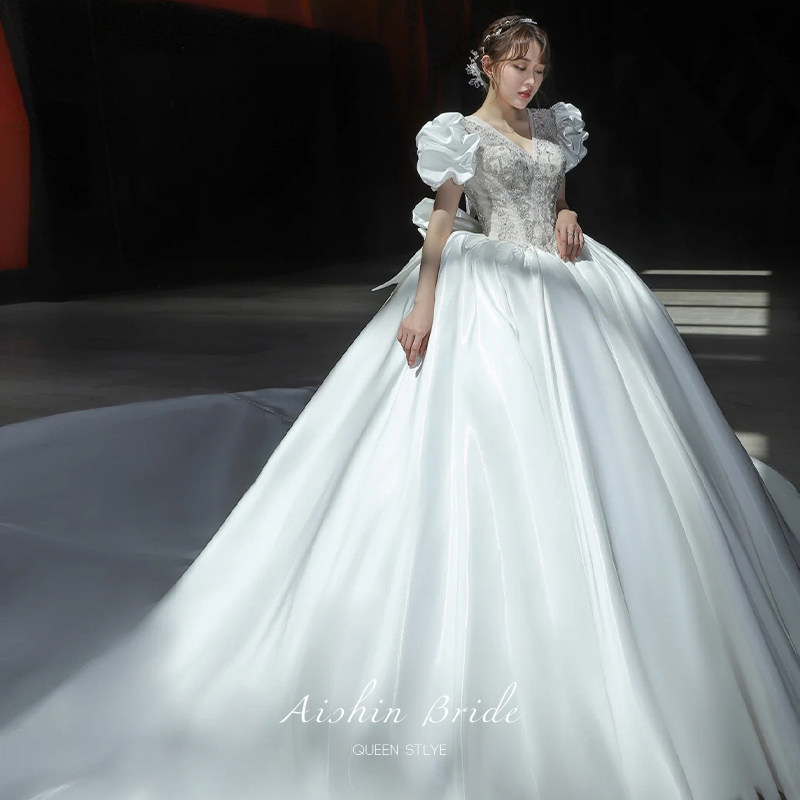 Wedding dress 2022 New brides French style Hepburn Palace Wind Satin high-end extravagant Luxury Temperament Bubble sleeves Trailing Spring Summer