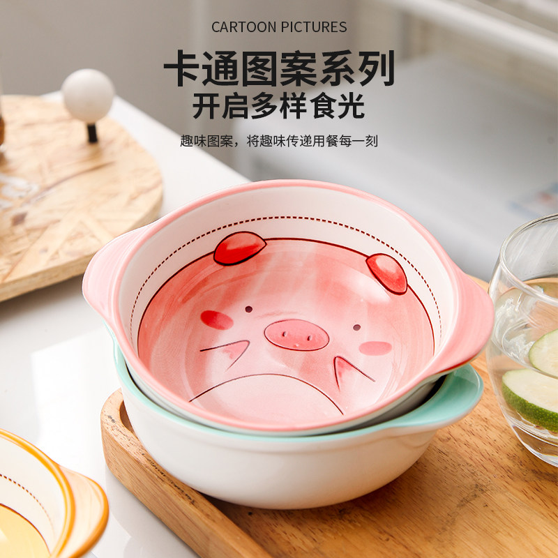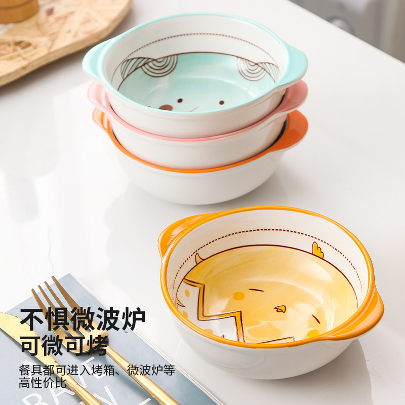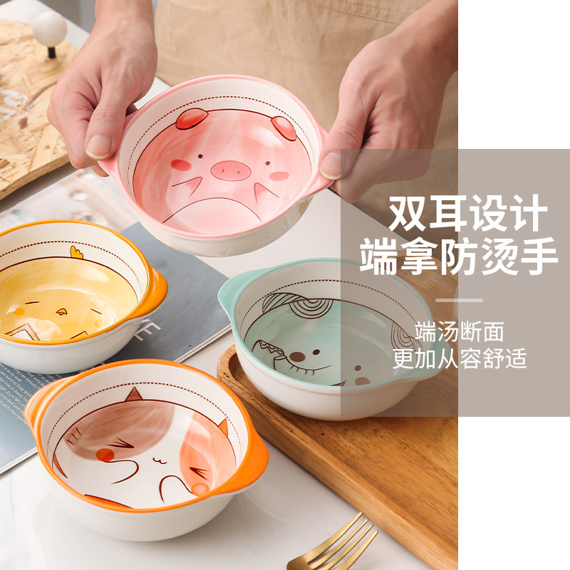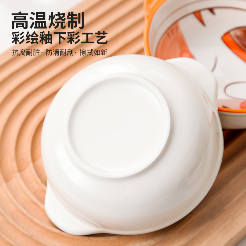 Cartoon cute children's tableware binaural anti-scalding baby food supplement bowl household ceramic underglaze color noodle bowl parent-child rice bowl