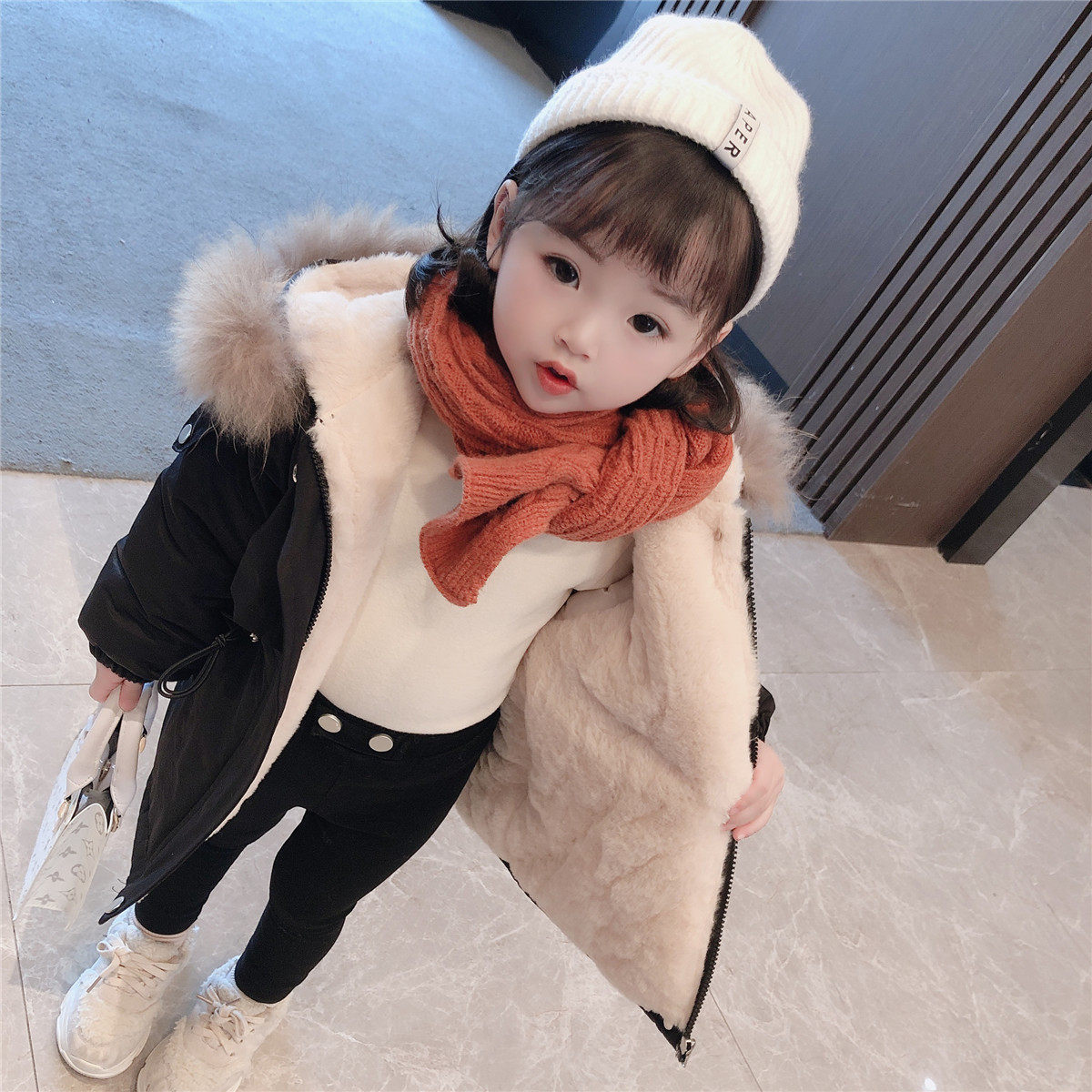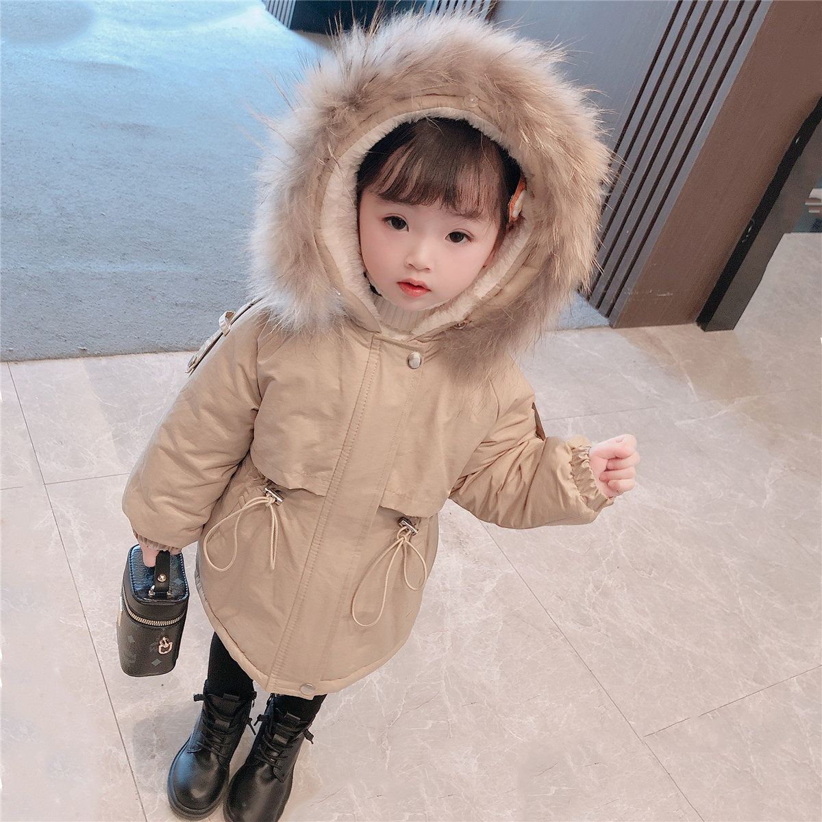 Girls' mid-length down cotton clothes children's plus velvet thick cotton clothes children's girls' baby pie overcome jacket winter clothes