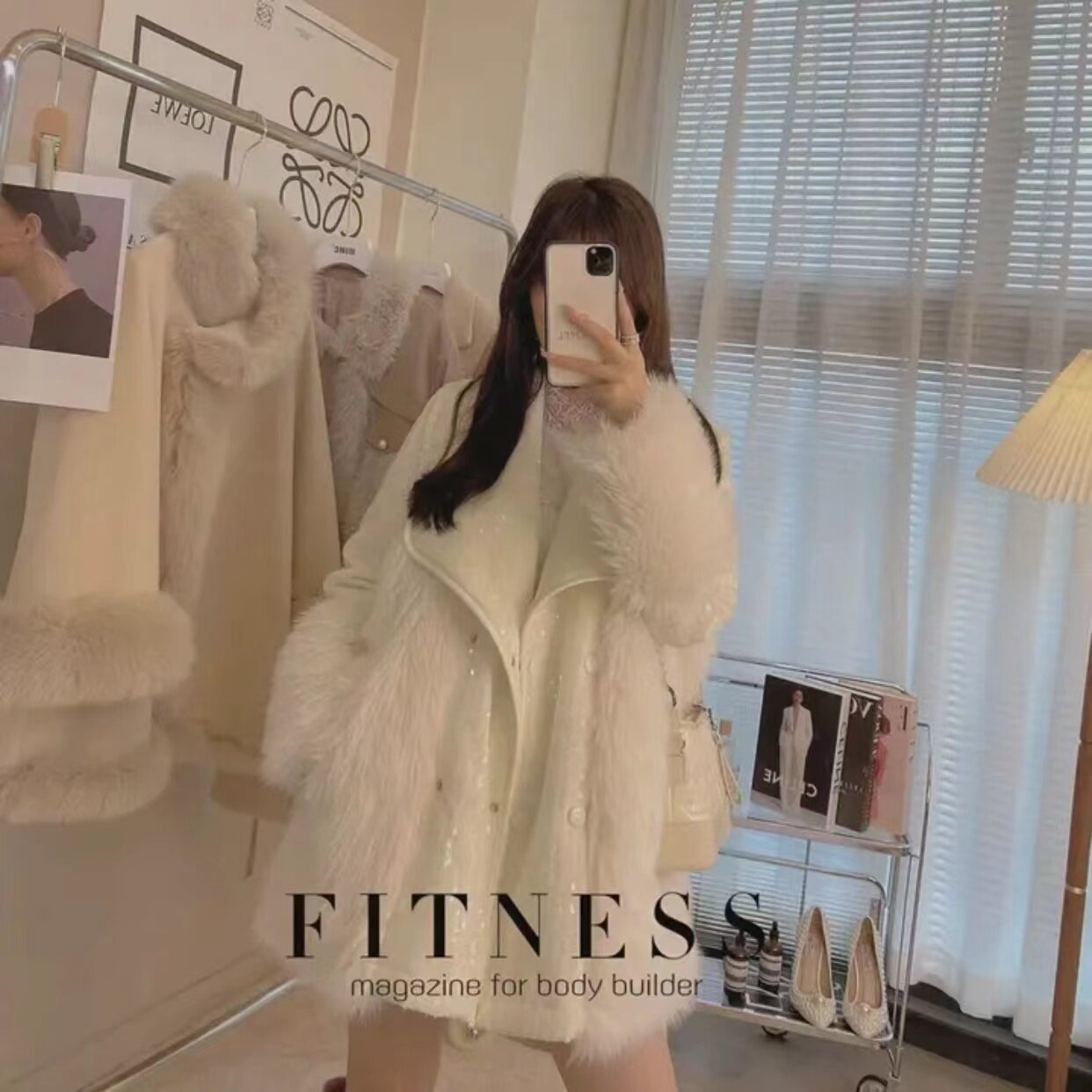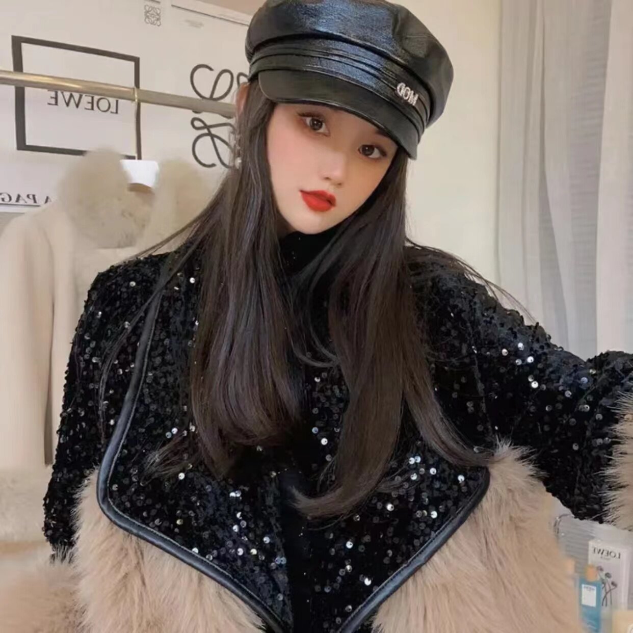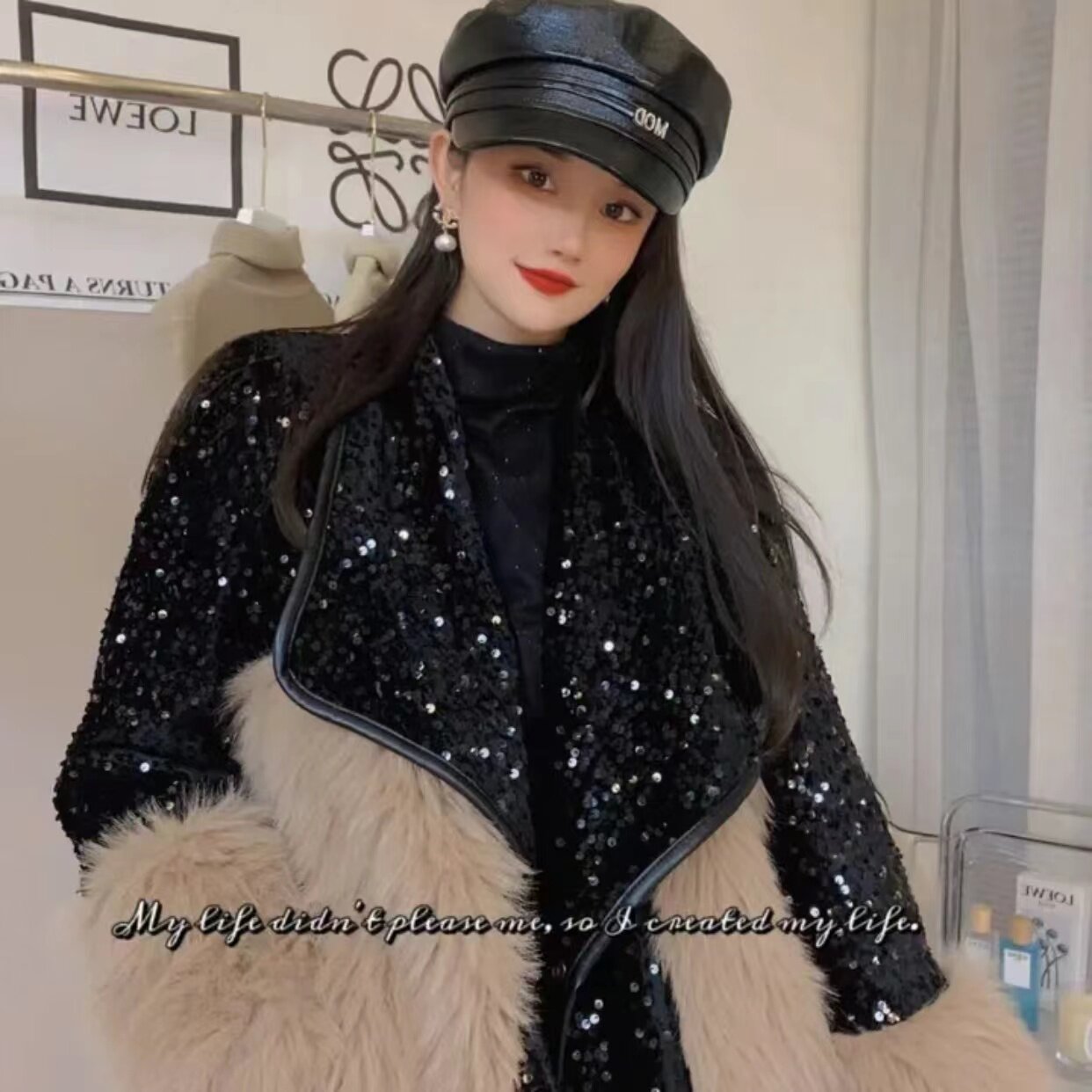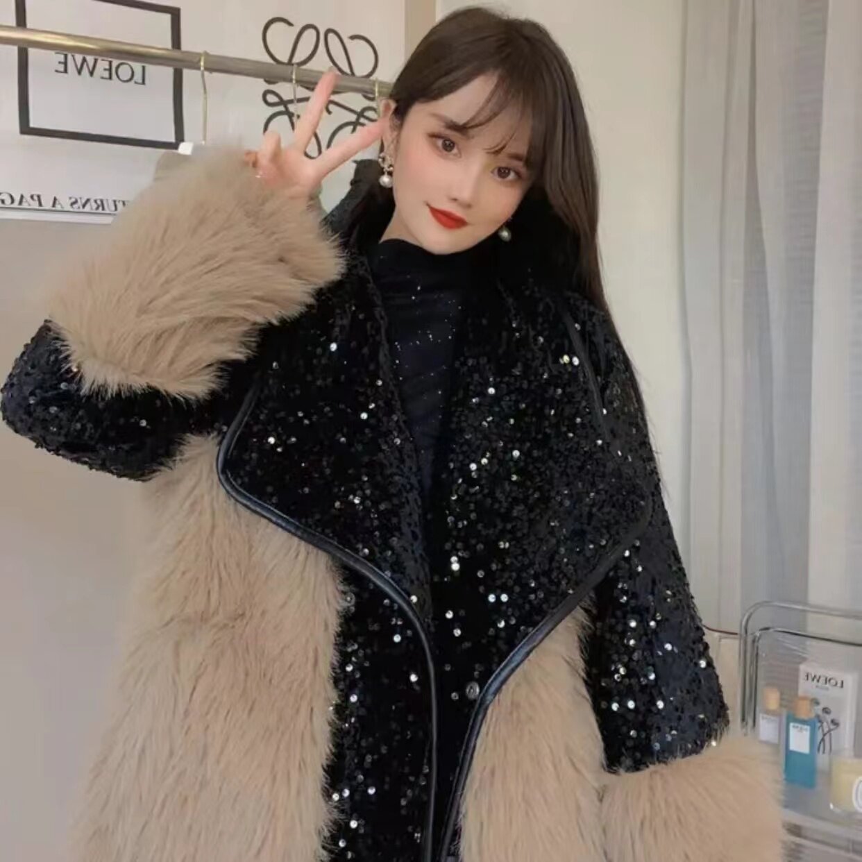 Winter elegant ladies environmental protection fur sequins stitching wool European goods ins suit collar mid-length heavy industry coat