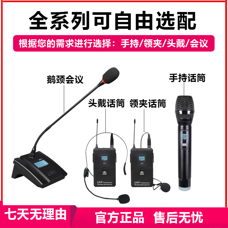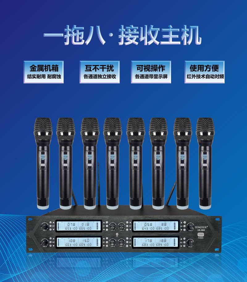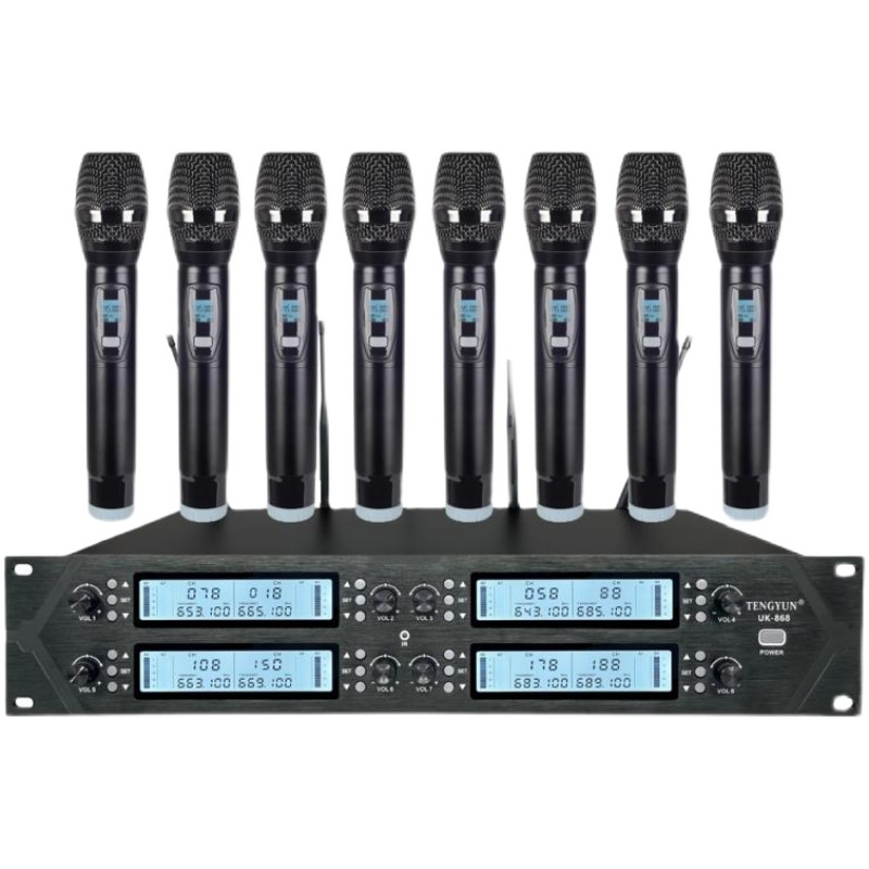 One for eight with eight handheld microphones One for eight with eight head-mounted microphones One for eight with eight lapel microphones One for eight with eight conference microphones One for eight mix and match