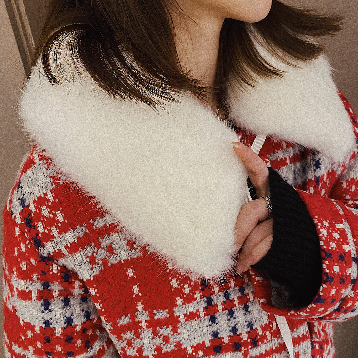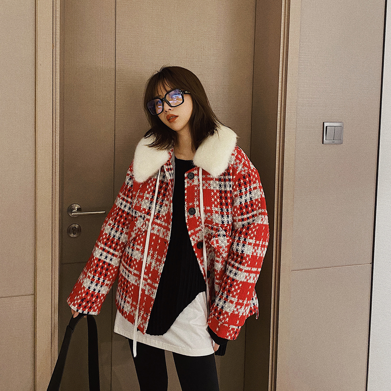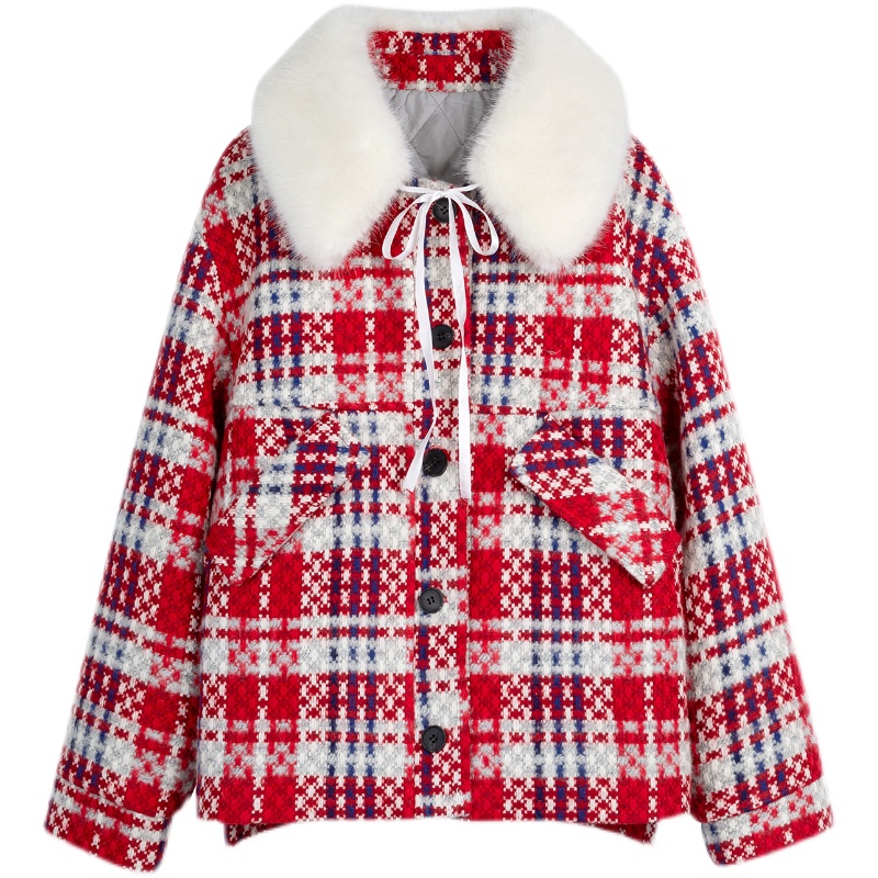 Xiao Nian Custom (Christmas Benefits) Red Plaid Tweet Coat Women's Winter Cotton Thickened Wool Neck Coat