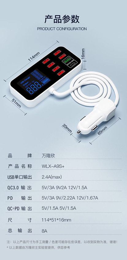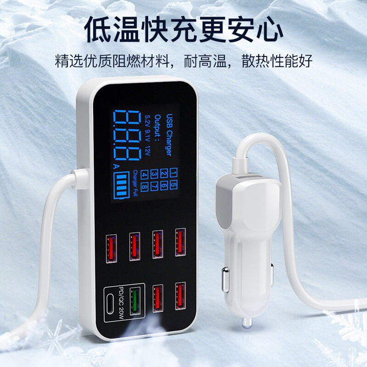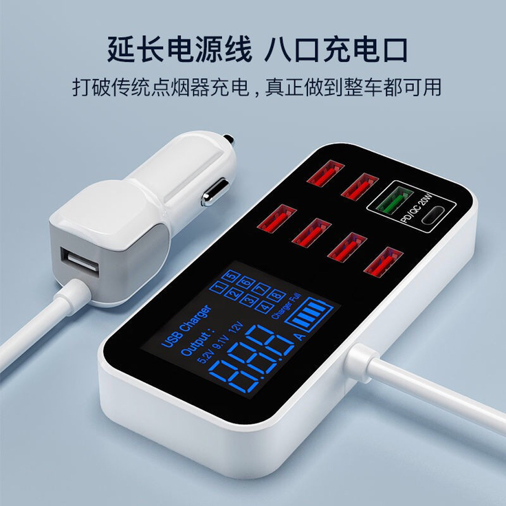 Car socket cigarette lighter charger 8-port QC30 fast charge multi-port usb charger with digital display PD charging head