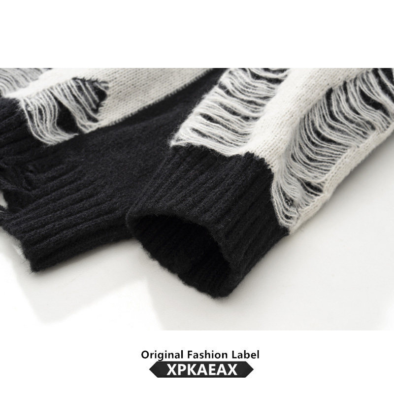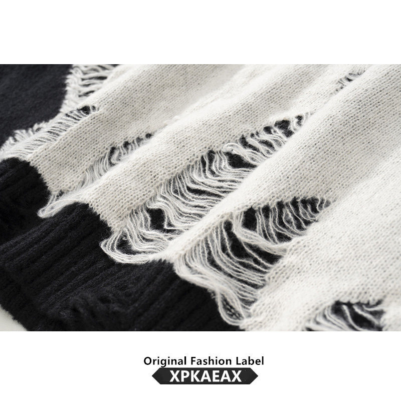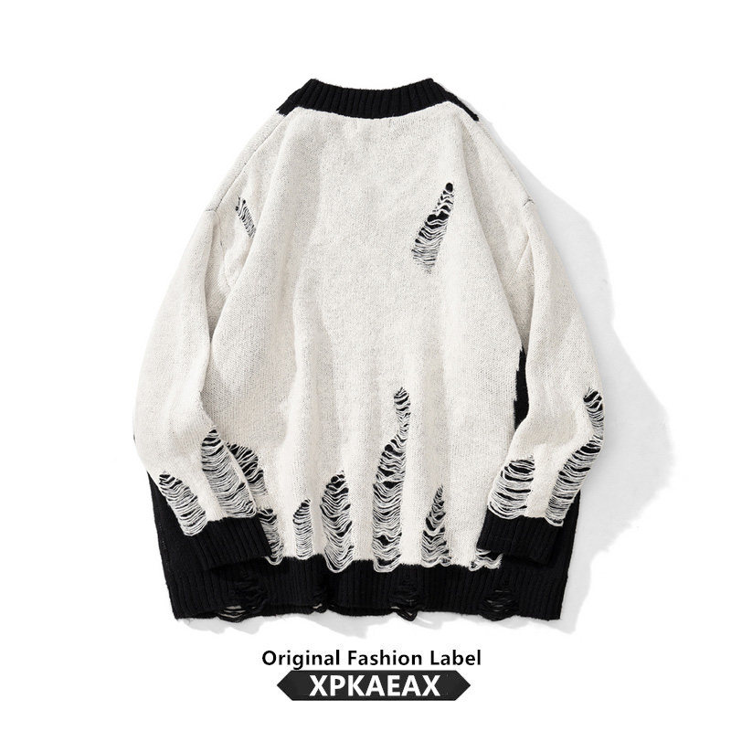 XPKAEAX Original Tide Card Small Crowd Design Sense Breaking Hole Line Clothes Men And Women Bf Wind Looters Lazy Collage of Knitted Cedar-Taobao