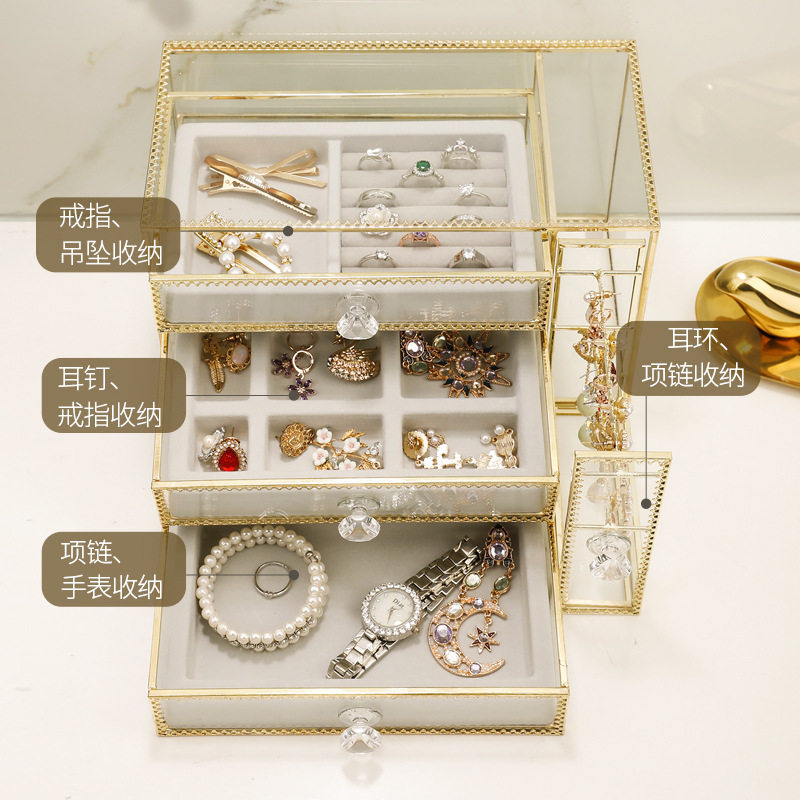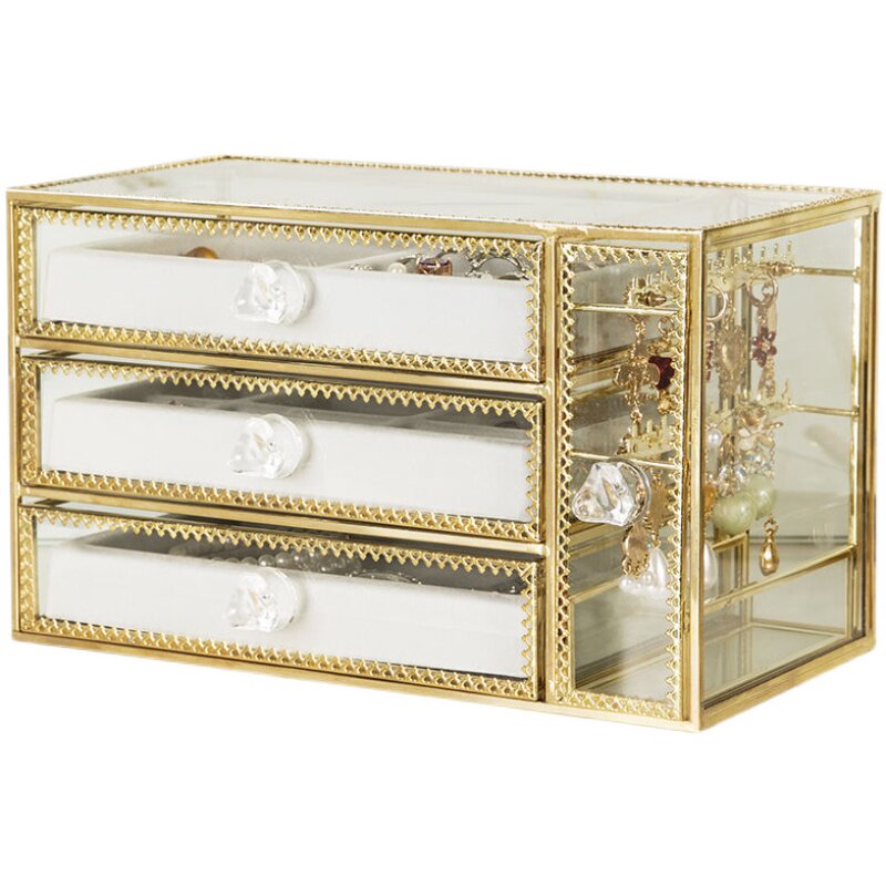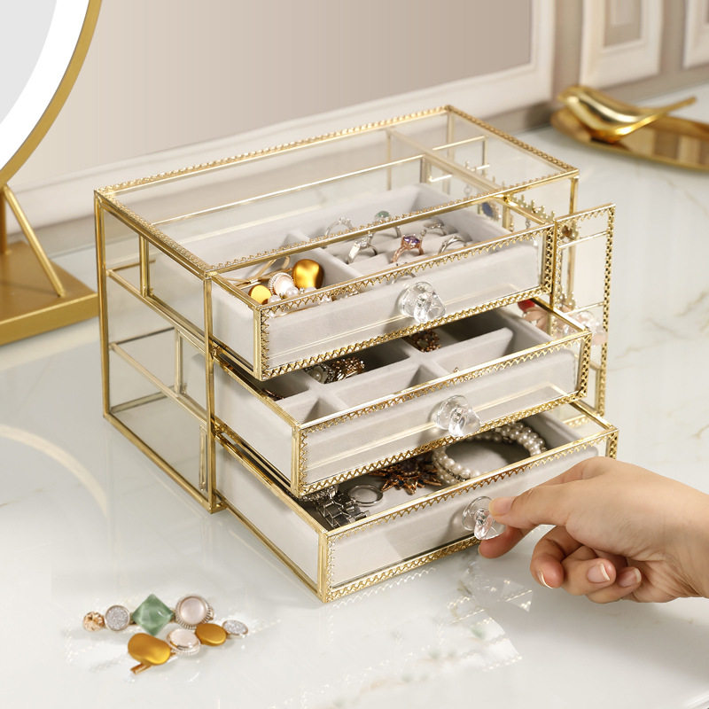 Three-drawer multifunctional jewelry box, electroplated copper edge, tempered